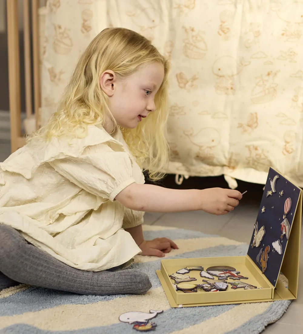 Hyggeligt Filibabba magnetlegetøj bestående af en gul æske med eventyrligt tema. Æsken indeholder 30 små magneter med motiver af bl.a. dyr, stjerner og luftballoner, som kan sættes på indersiden af æsken, og lave hyggelige billeder. Perfekt til fantasifuld leg og kreativ udfoldelse.
