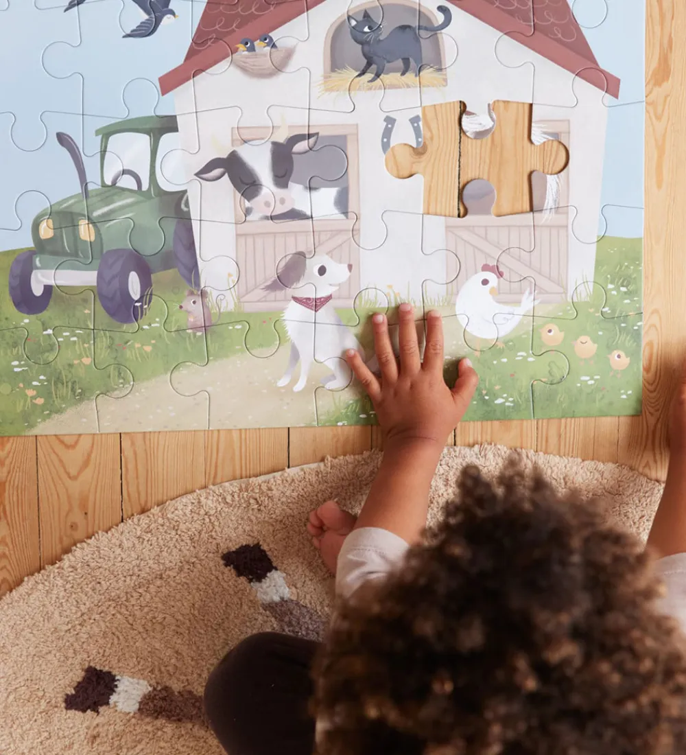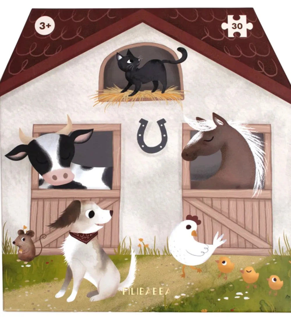 Fine Filibabba puslespil med 30 brikker og motiv af en bondegår med dyr og traktor.