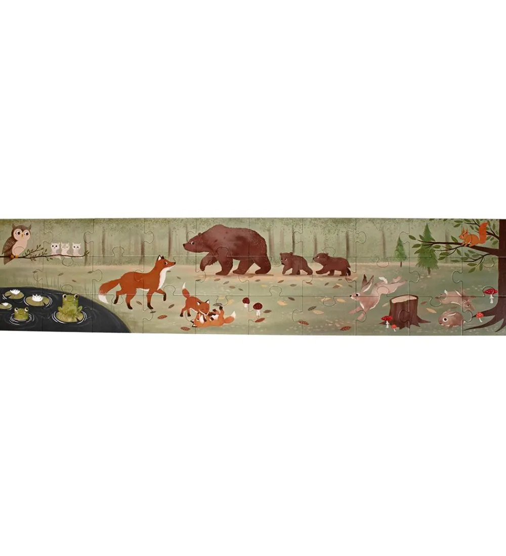 Sjovt Filibabba puslespil med et flot motiv af en skov, med forskellige dyr og dyreunger i en håndtegnet kvalitet.