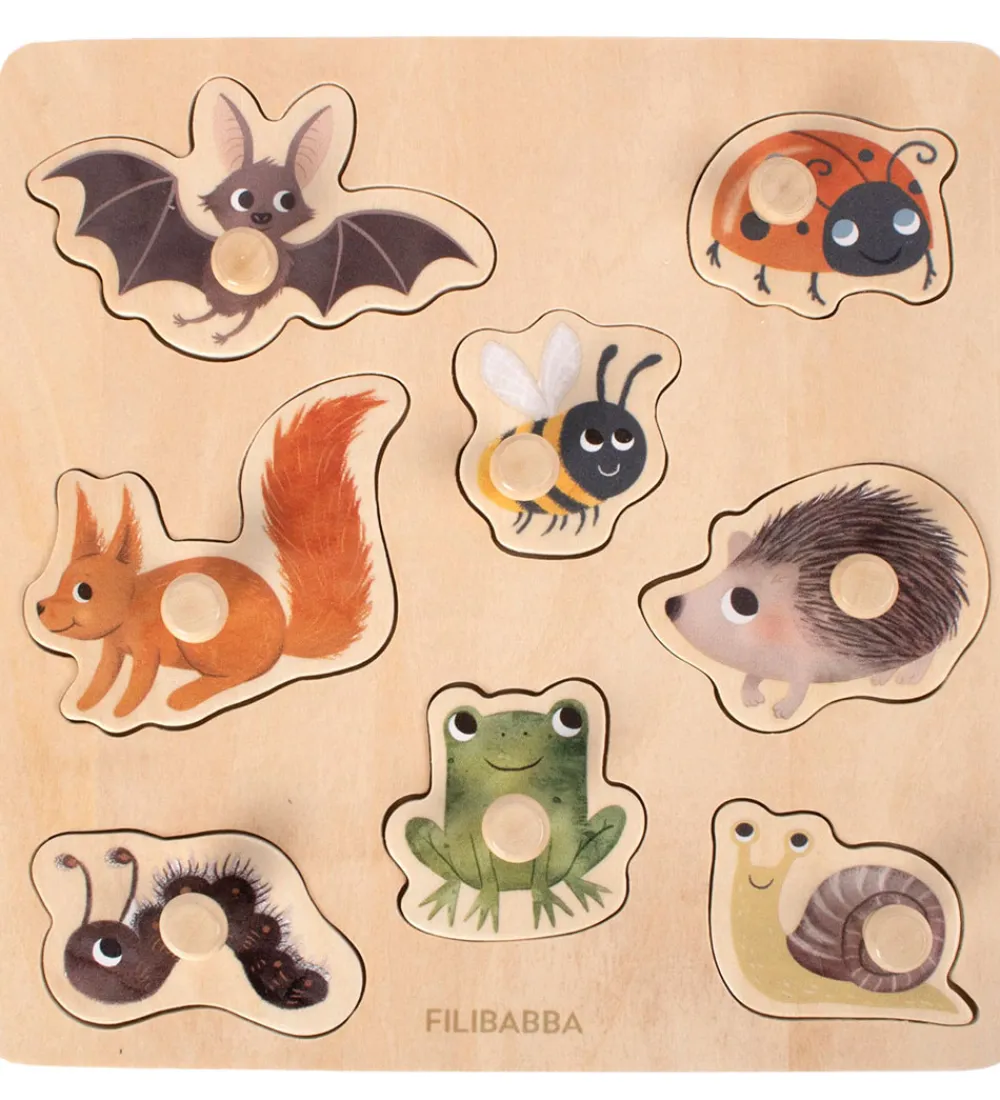 Fint Filibabba puslespil med 8 brikker med små håndtag og motiver af skovens dyr, der skal placeres det rigtige sted på pladen.