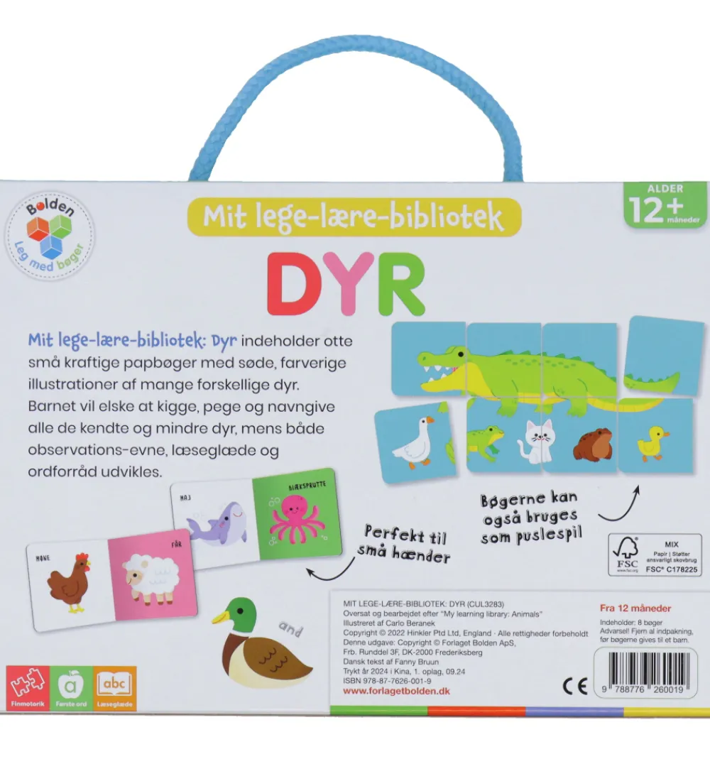 Fine Forlaget Bolden bøger i en farverig pakke, der udgør “Mit lege-lære-bibliotek” med titlen Dyr. Pakken indeholder 8 små bøger: