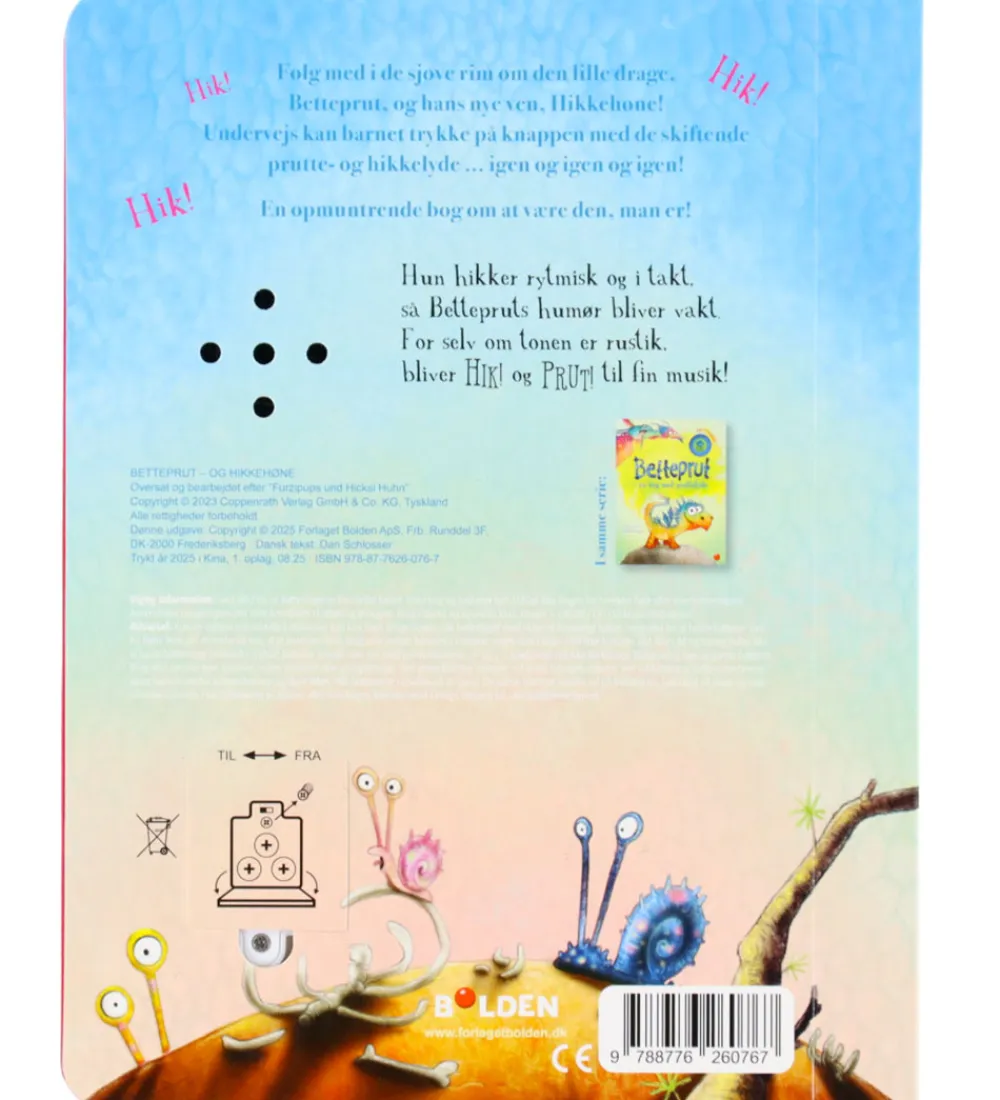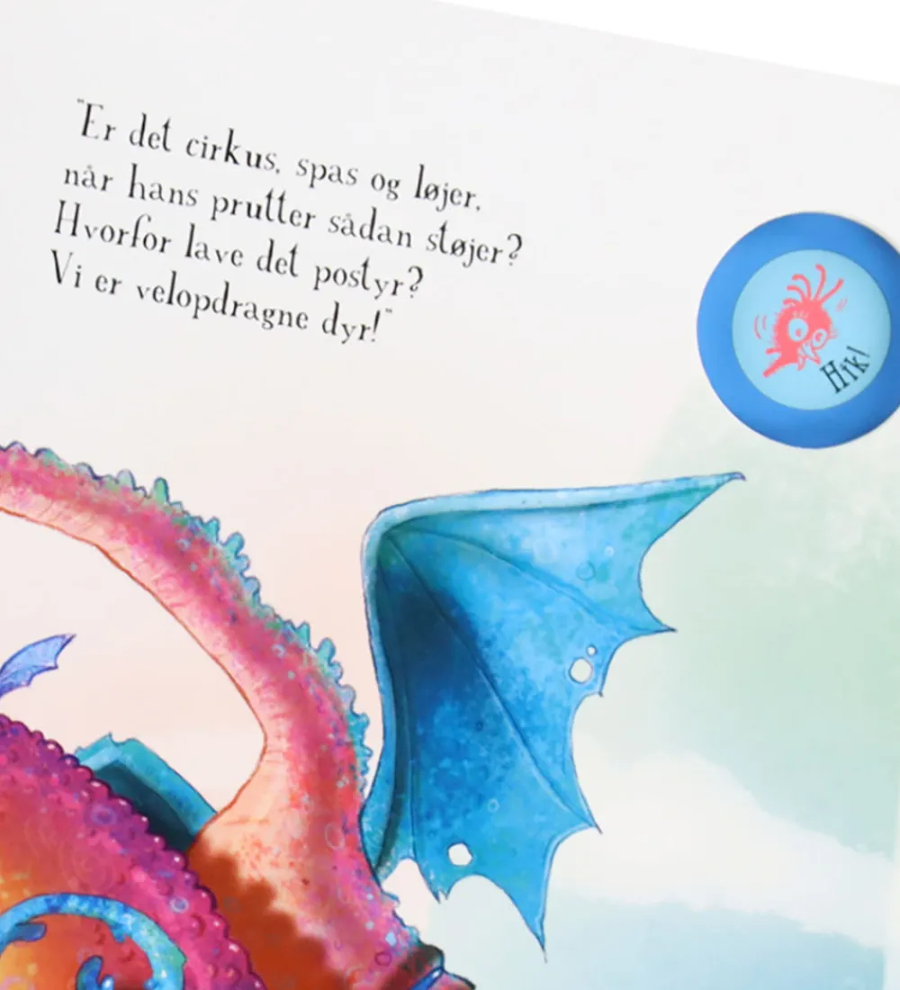 Forlaget Bolden bogen byder på sjove rim om den lille drage og hans nye ven “Hikkehøne”. Undervejs i bogen kan barnet trykke på knappen og aktivere sjove prutte- og hikkelyde.