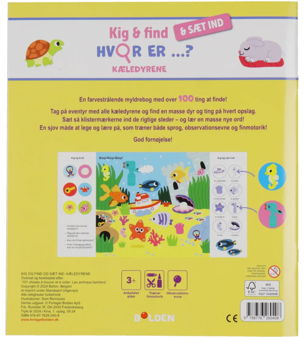 Sød Bolden bog med titlen “Kig og find og sæt ind, hvor er…? kæledyrene”.