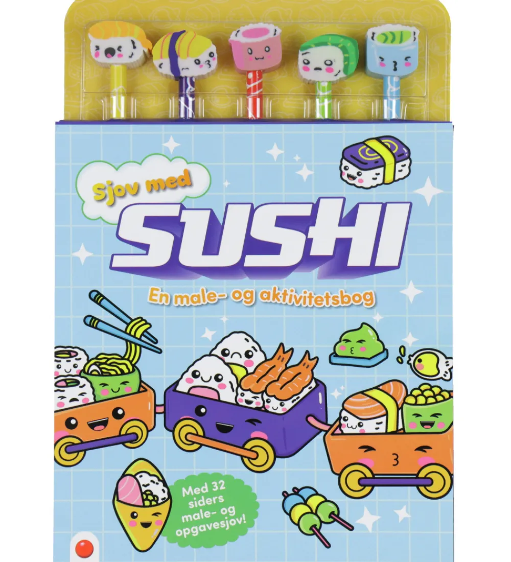 Sjov Forlaget Bolden male- og aktivitetsbog i et “Sjov med sushi”-tema samt fem, medfølgende blyanter (1 alm., 4 farve) med store viskelædere i enden.