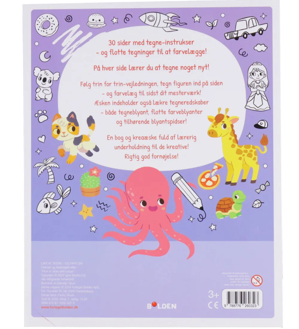 Bolden malebogen indeholder seks farveblyanter, en almindelig blyant og en blyantspidser. Malebogen har 30 sider med tegne-instrukser og tegninger som skal farvelægges. På hver side lærer man at tegne noget nyt, hvilket indbyder til mange timers kreativitet.