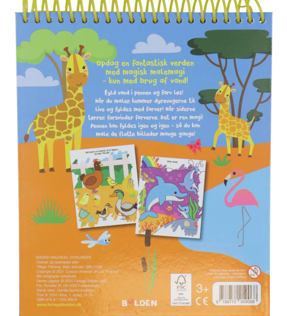 Forlaget bolden malebogen har spiralryg og kraftige sider med motiver, der skal males med den medfølgende, magiske pen, som fyldes med vand. Når vandet fra pennen rammer illustrationerne, toner farverne frem.