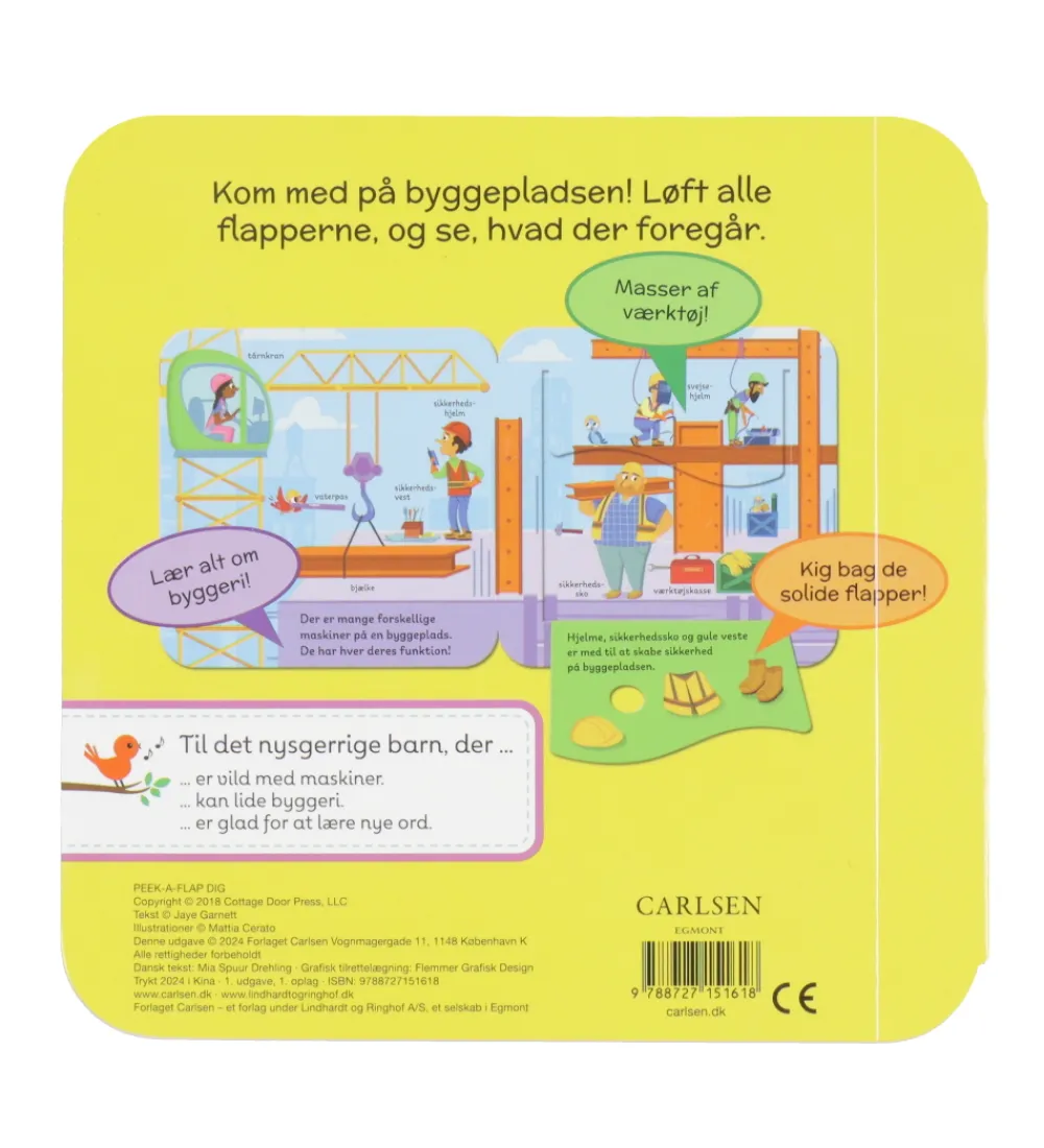 Forlaget Carlsen billedbogen er en sød lille bog med store, tykke flapper, der gemmer på mangt og meget fra byggepladsens fascinerende verden. Bogens sider er i kraftigt pap, så de tåler at blive vendt igen og igen.