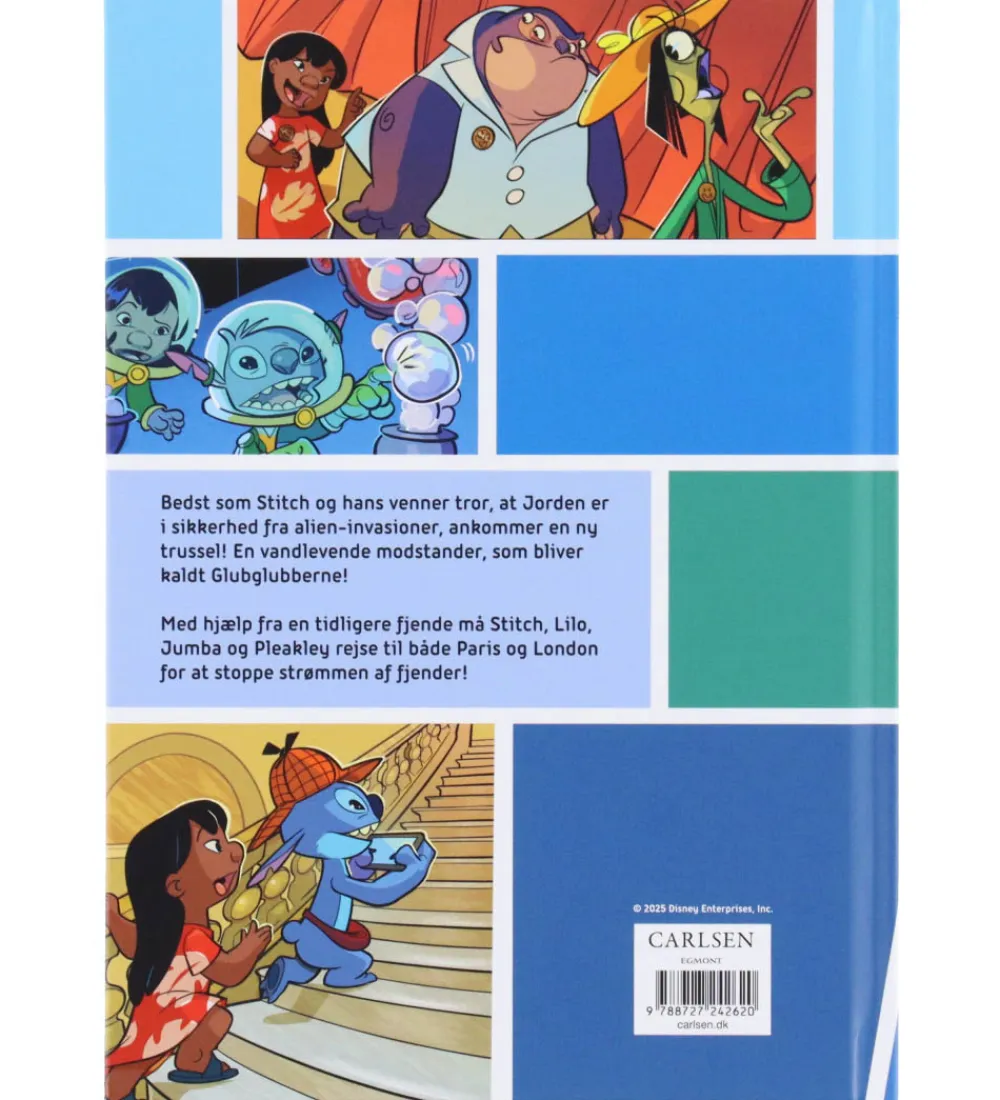 Forlaget Carlsens bog indeholder en farverig grafisk roman om Stitch og hans venner, der tror, at verden er i sikkerhed fra alien-invasioner. Men de opdager en ny trussel – en vandlevende modstander, kaldet Glubglubberne.