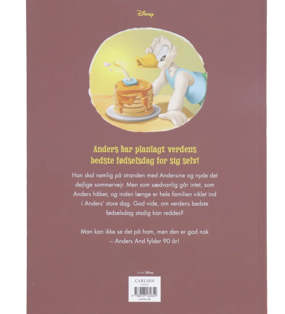 Forlaget Carlsen bogen indeholder en hyggelig historie om Anders And, der skal holdes sin fødselsdag på stranden, men intet går, som det skal. Bogen er lavet i forbindelse med, at Anders And-figuren fylder 90 år. Bogen er indbundet og indeholder 32 sider.