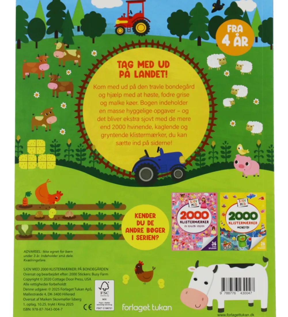 Farverig Forlaget Tukan aktivitetsbog med titlen “Sjov Med 2000 Klistermærker – På Bondegården”.
