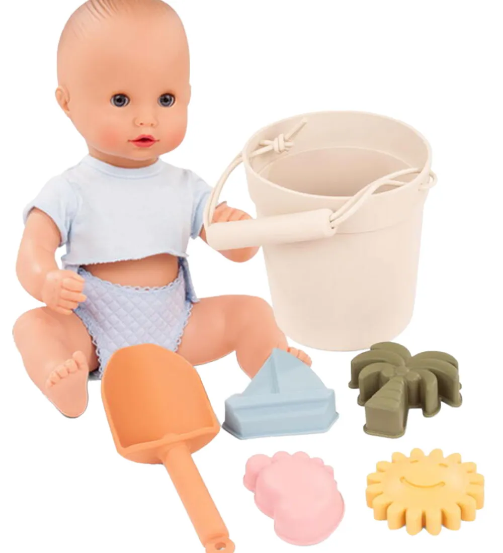 Sød Götz dukke med et fint blåt sæt, samt medfølger der et strandsæt i silikone der indeholder følgende:
