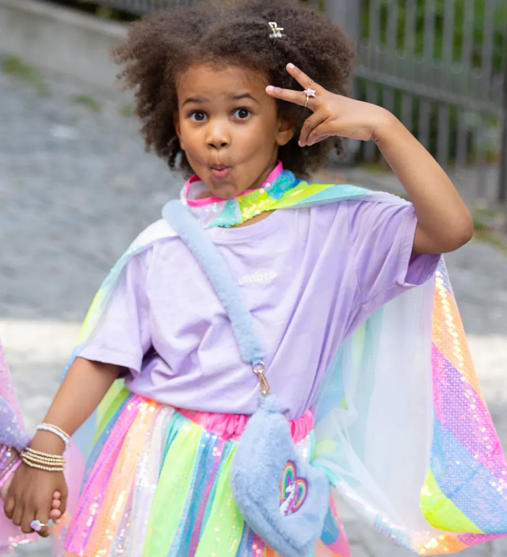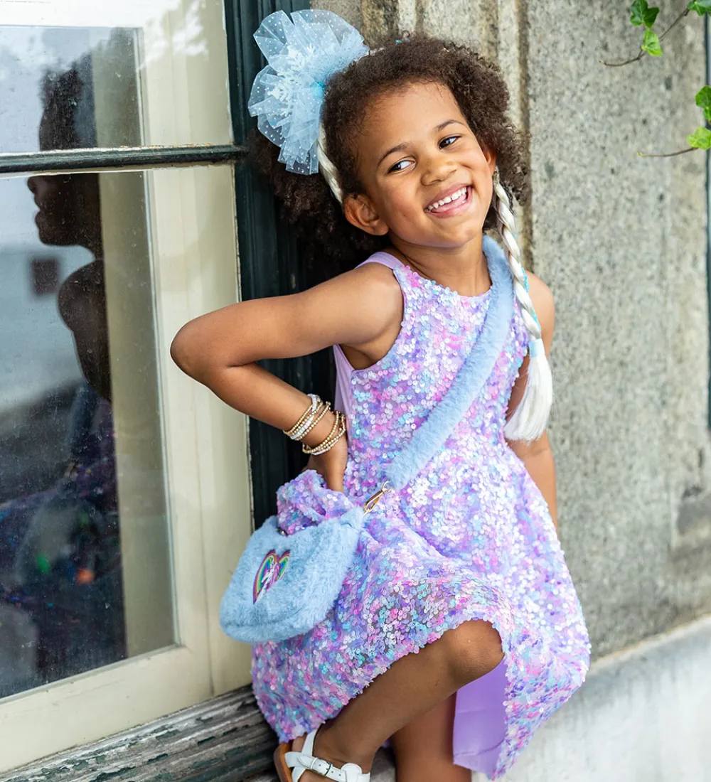 Sød Great Pretenders skuldertaske med et sødt enhjørning- og regnbueprint på fronten. Tasken er i en flot blå nuance og har en blød overflade af imiteret pels, samt en praktisk skulderrem.
