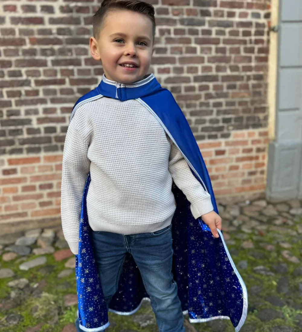 Sej Great Pretenders udklædning i blå med et glitrende stjernemotiv indvendigt. Denne kappe tilføjer eventyrlige elementer til enhver leg, og den er et must-have for små superhelte.