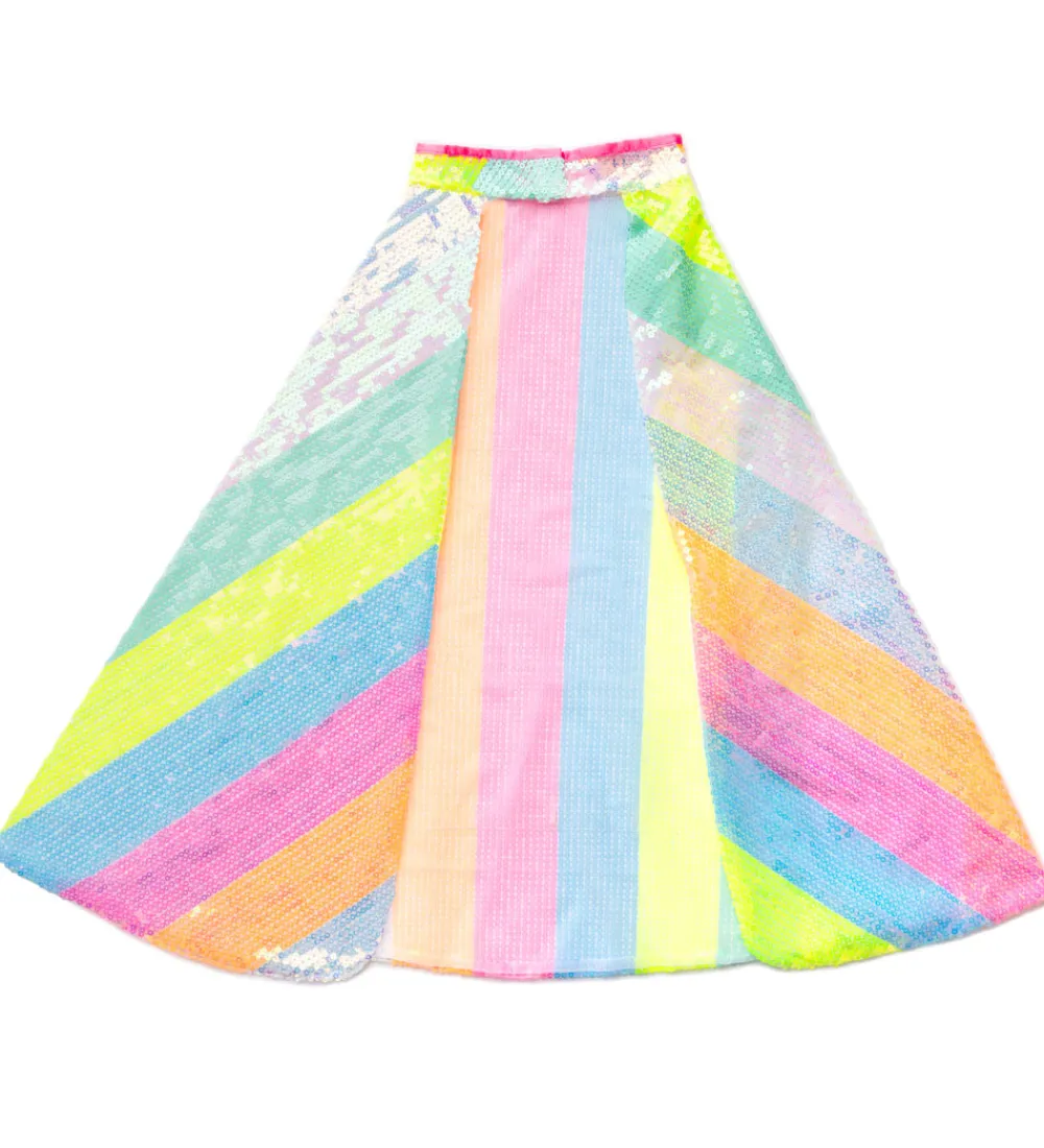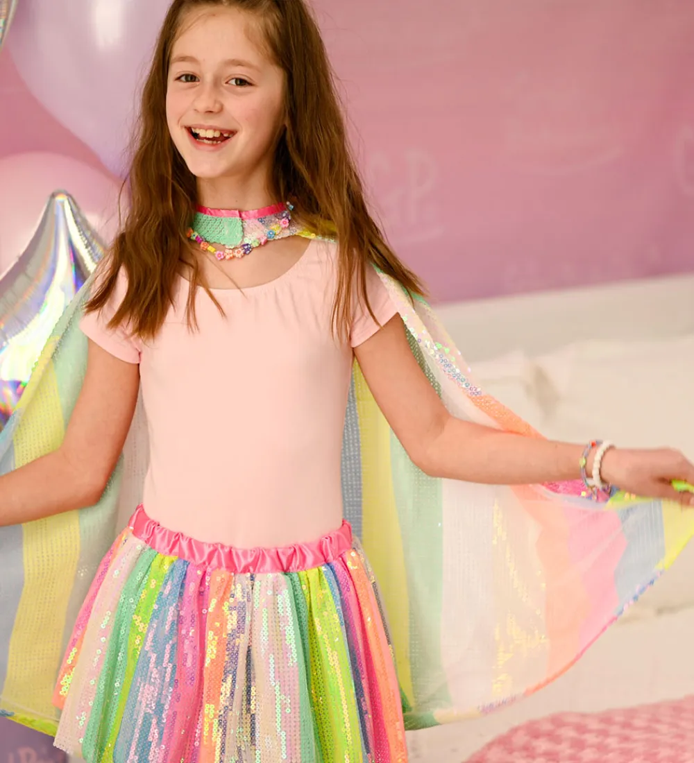 Flot Great Pretenders udklædning i form af en kappe med striber af palietter i rosa, blå, gul, grøn, pink, hvid og orange.
