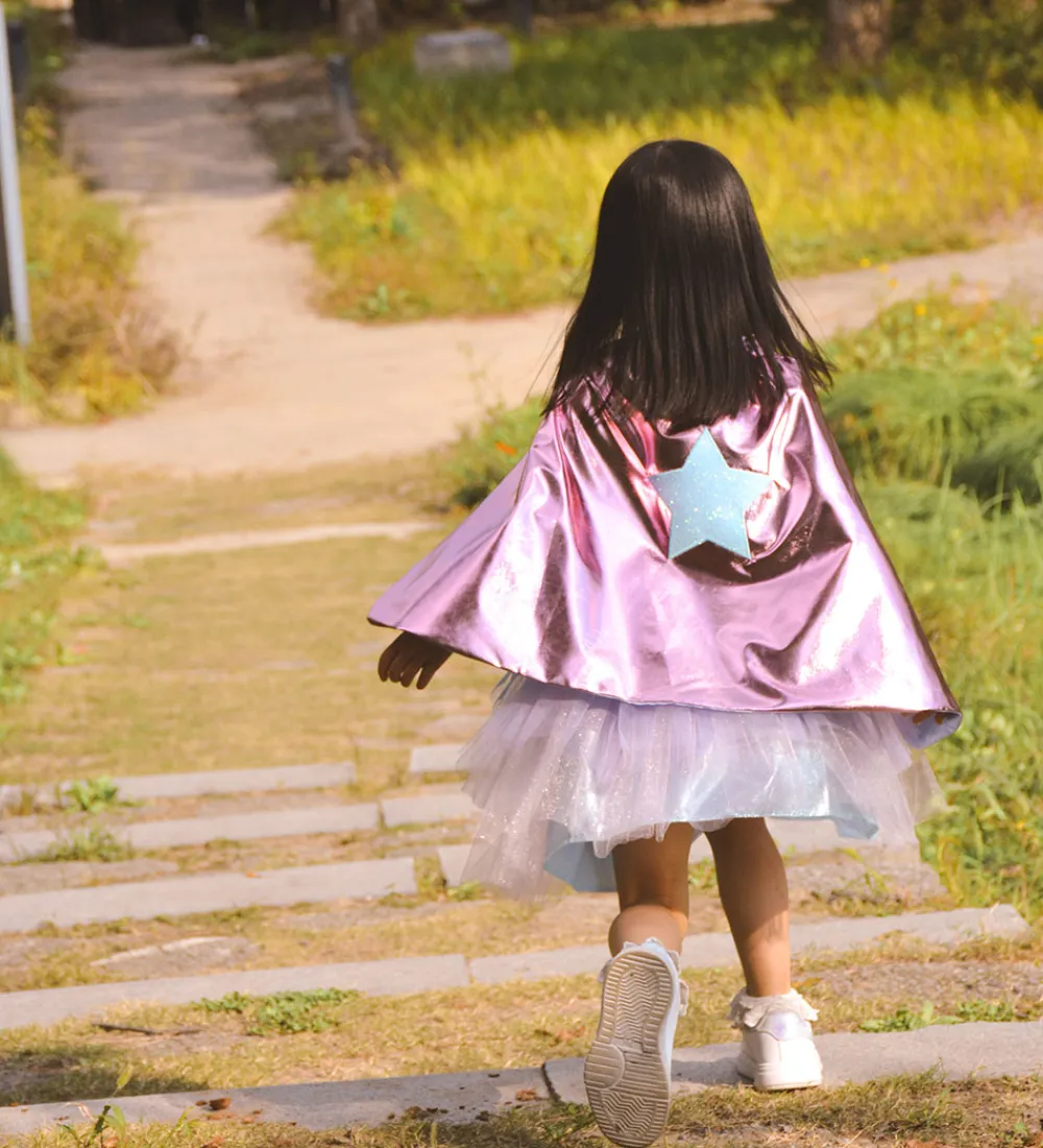 - En kappe i rosa med et skinnende holografisk ydre lag med en stor stjerne på ryggen i lyseblå og med en lyseblå inderside.