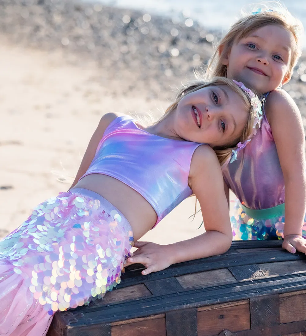 Farverig Great Pretenders udklædning bestående af en glitrende nederdel med flotte palietter i nuancer af lilla og en let pink underdel af tyl. Sættet inkluderer en matchende hår clips, der fuldender looket.