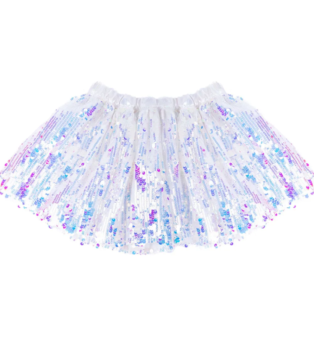 Flot Great Pretenders udklædning i form af en nederdel med metalliske pailletter i hvid og lilla. Great Pretenders udklædningen er med elastikkant i livet og på indersiden har den et lag af hvidt tyl.