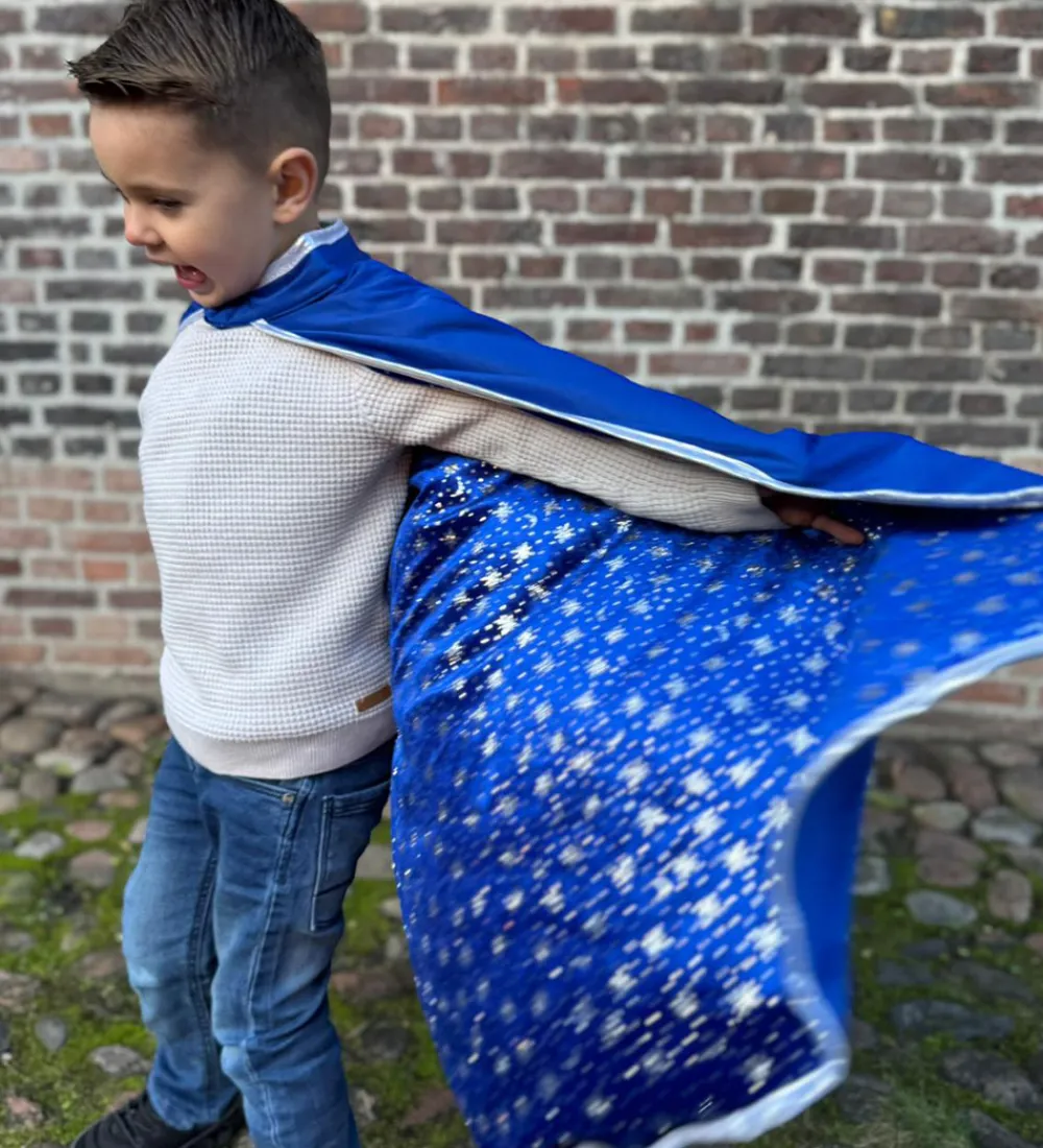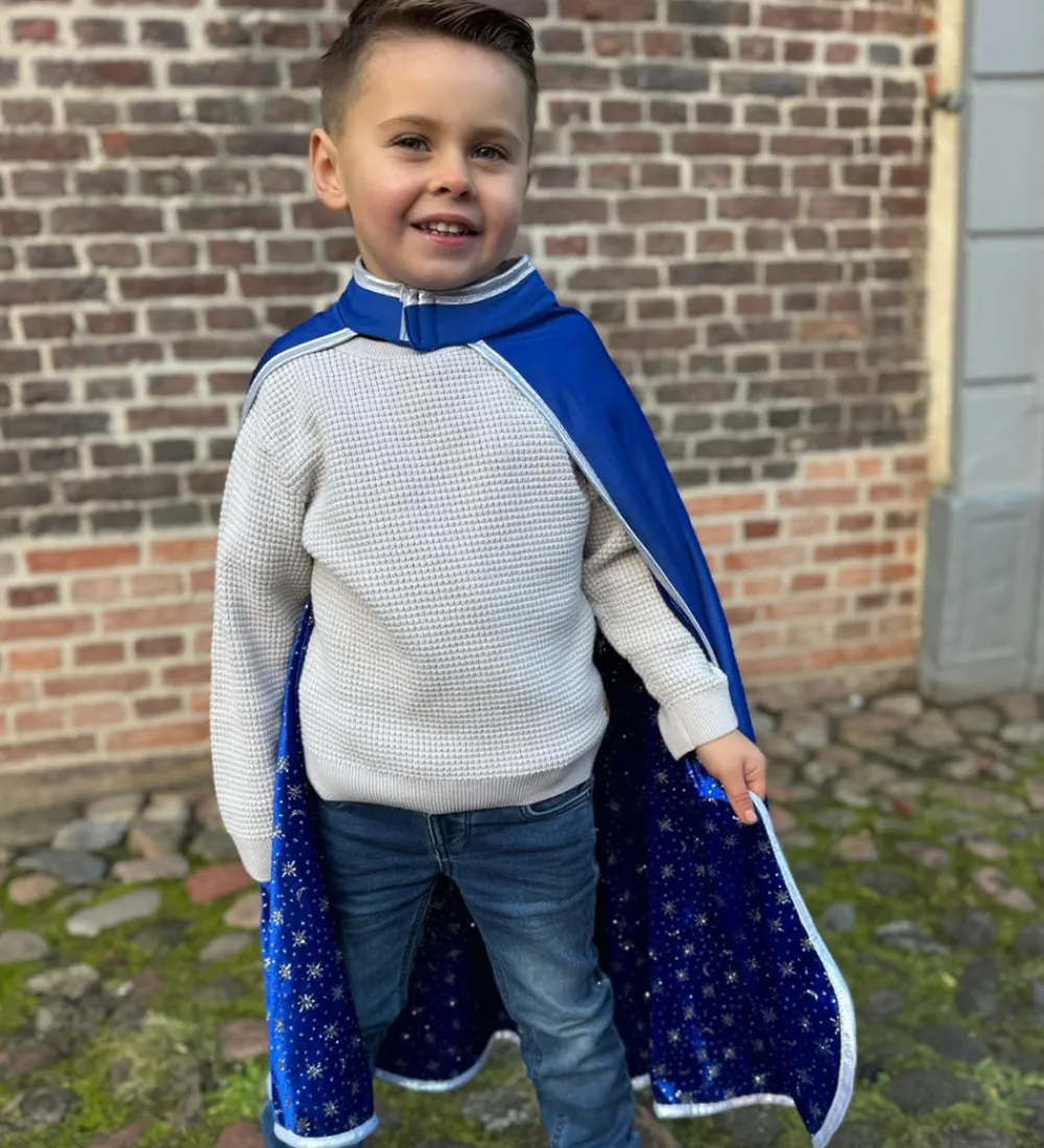 Flot Great Pretenders udklædning i en dyb blå nuance med et glitrende stjernemotiv indvendigt. Denne kappe tilføjer eventyrlige elementer til enhver leg, og den er et must-have for små superhelte.