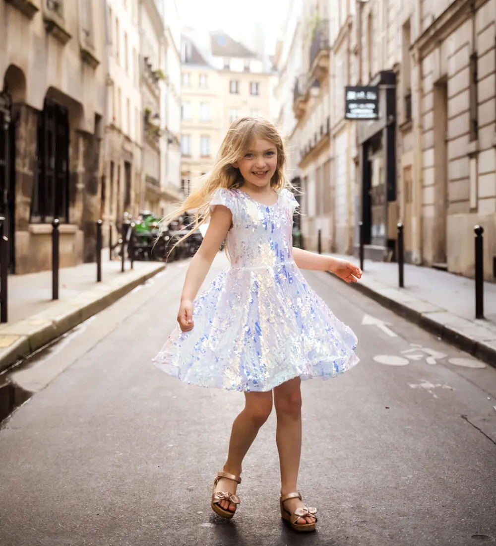 Flot Great Pretenders udklædning i form af en metallisk kjole med hvide og lilla pailletter, så barnet kan klæde sig ud som en pailletkoncert-dronningen.