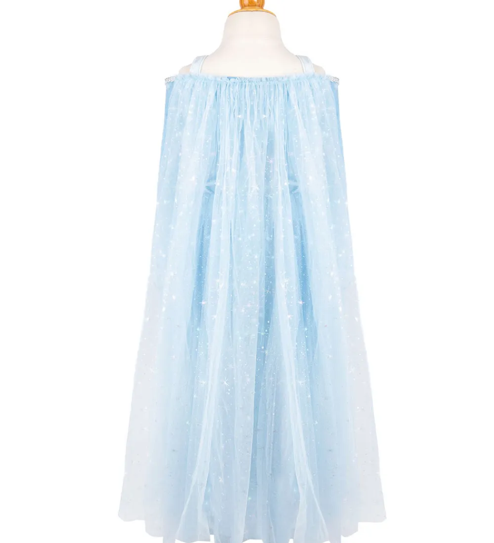 Elegant Great Pretenders udklædning i en lys blå farve med lange ærmer. Kjolen har en flot kappe af tyl med små holografiske prints på, der giver et festligt udtryk.