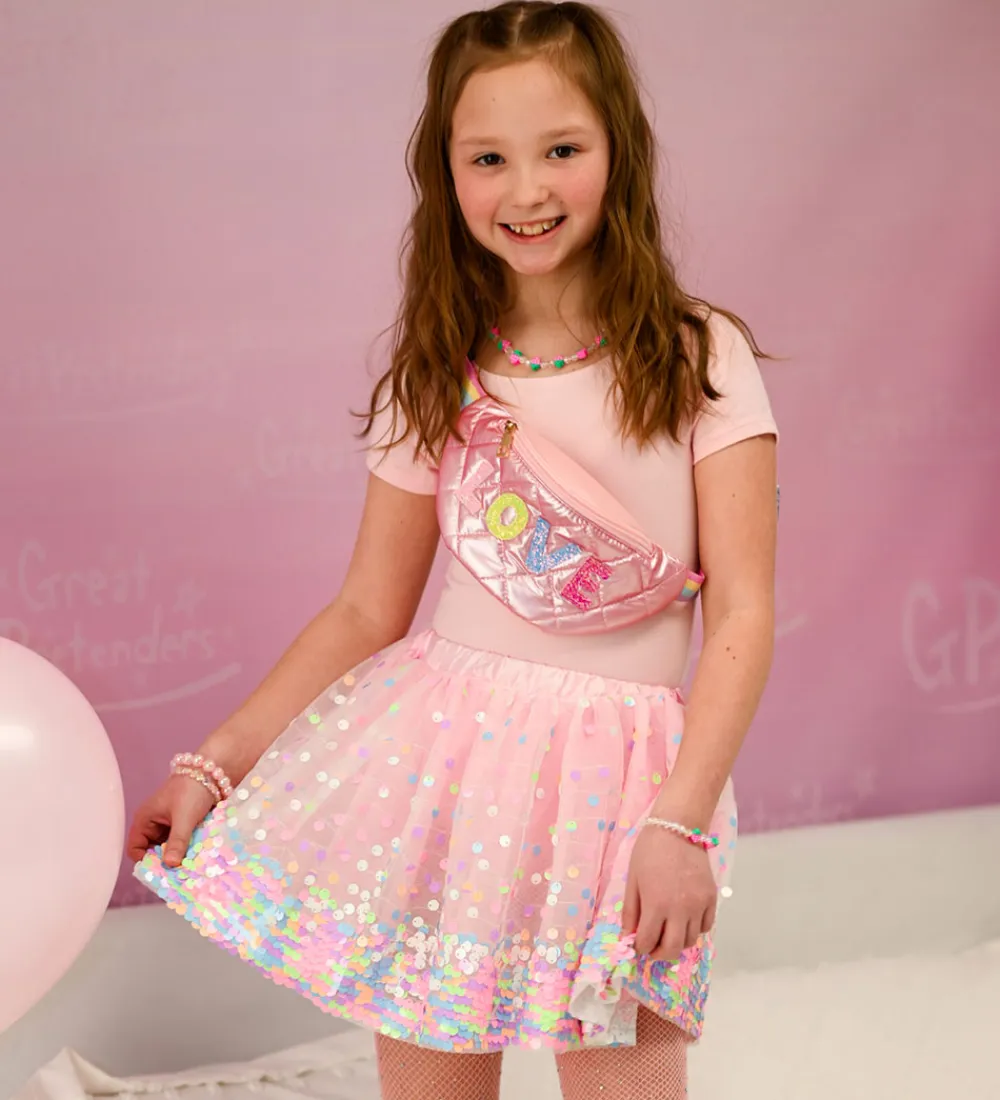 Flot Great Pretenders skuldertaske i skinnende rosa, imiteret skind og med en side, der er lavet som en farverig glimmerregnbue.
