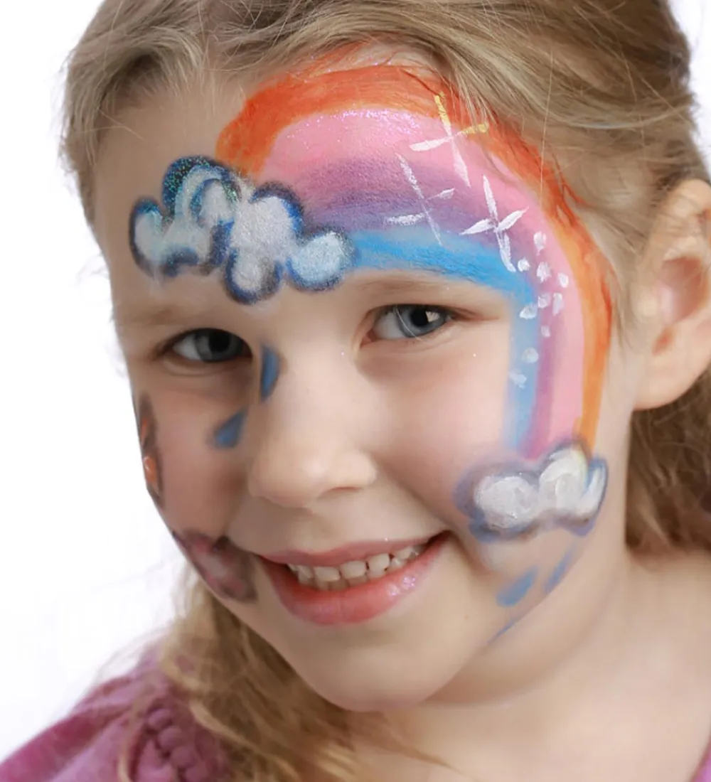Sød Grim Tout ansigtsmaling i en pakke, der indeholder 6 forskellige farver: orange, pink, lilla, blå, grøn og brun.
