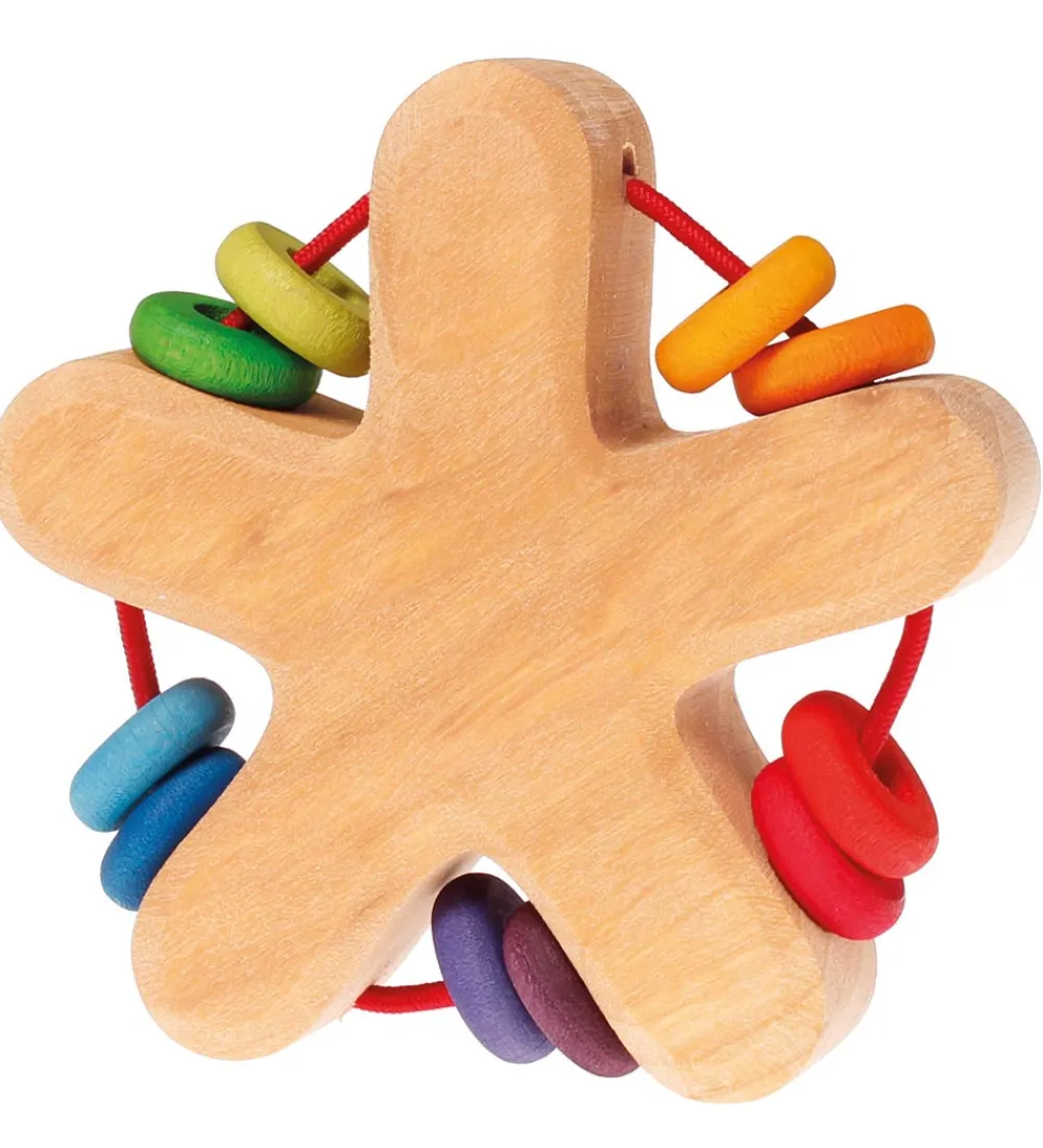 Sjov Grimms rangle med form som en stjerne. Den primære del er i naturlig træ, mens ringene i siderne er i blå, grønne, lilla, røde og gule nuancer.
