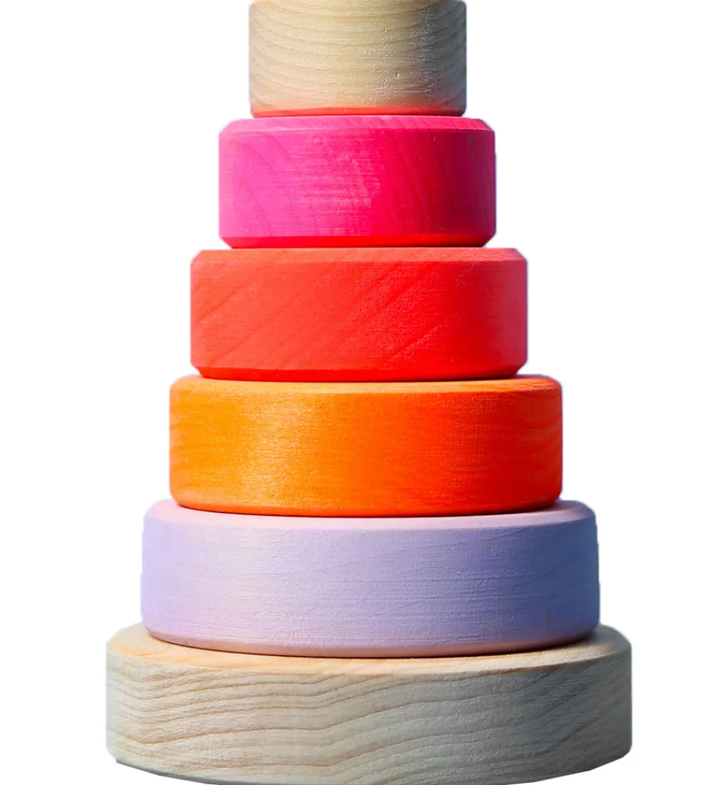 Skønt Grimms stabletårn af træ i rosa og lilla nuancer.
