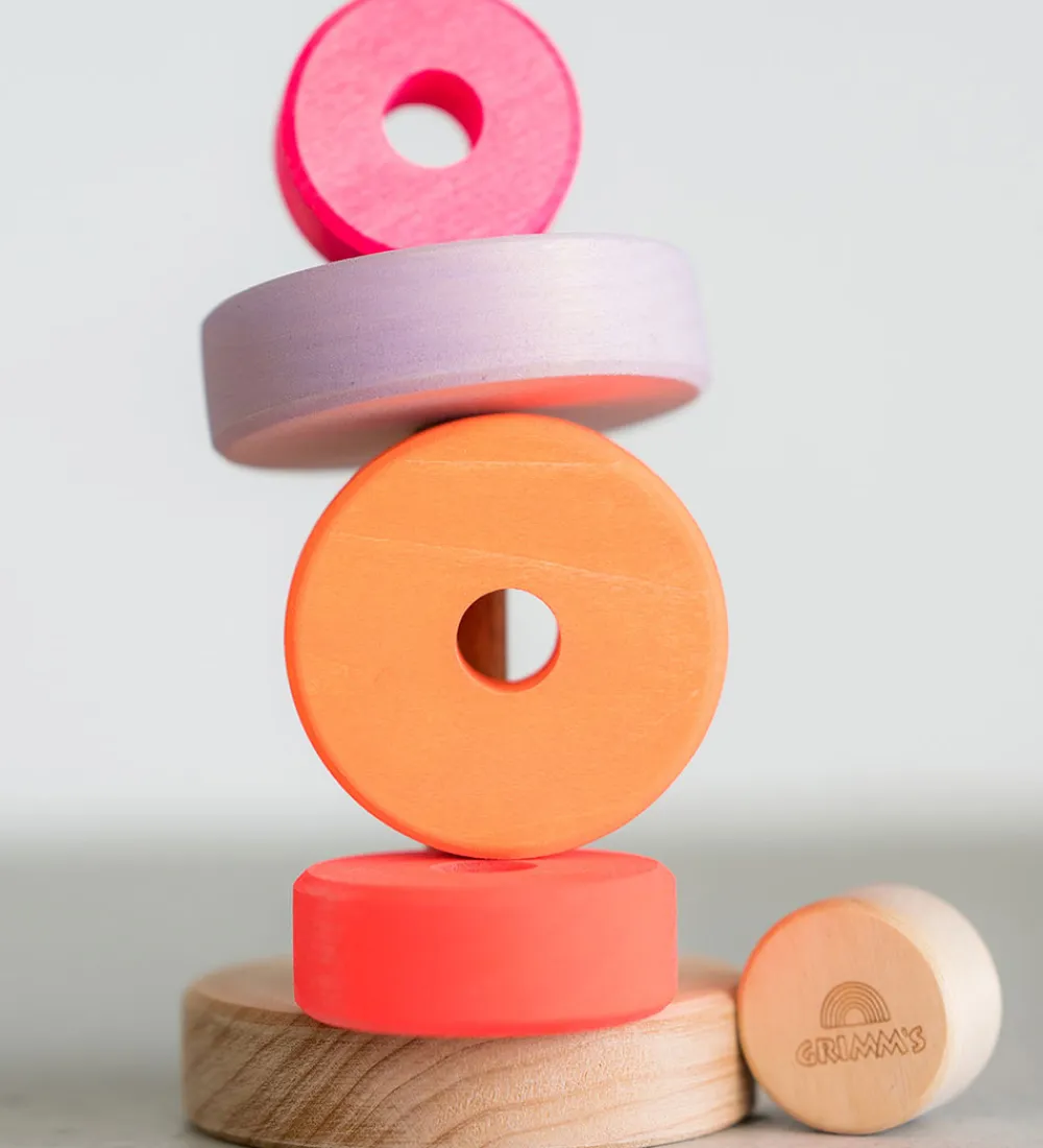 Grimms stabletårnet består af en bund med en rund pind, hvorpå ringene bliver placeret. Der er i alt fem ringe i forskellige farver og størrelser. Stabletårnet er lavet i træ og er perfekt til de små, som stadig er ved at øve motorikken og den logiske sans. Lagene passer alle sammen, så de små skal finde den rigtige rækkefølge.