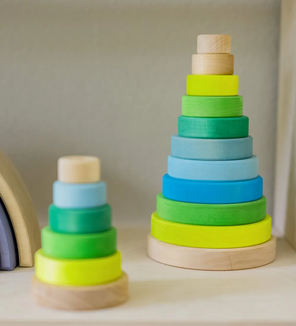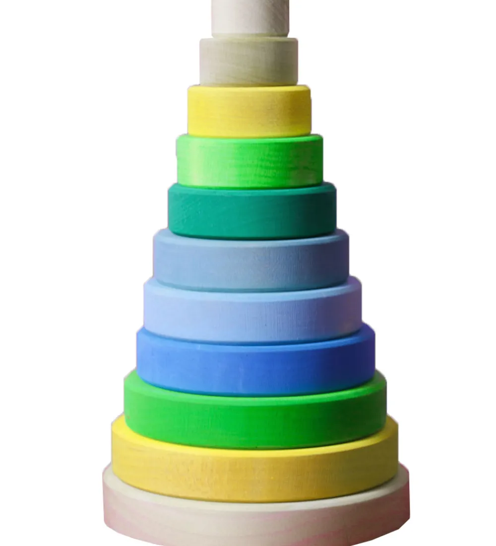 Grimms stabletårnet består af en bund med en rund pind, hvorpå ringene bliver placeret. Der er i alt ti ringe i forskellige farver og størrelser. Stabletårnet er lavet i træ og er perfekt til de små, som stadig er ved at øve motorikken og den logiske sans. Lagene passer alle sammen, så de små skal finde den rigtige rækkefølge.