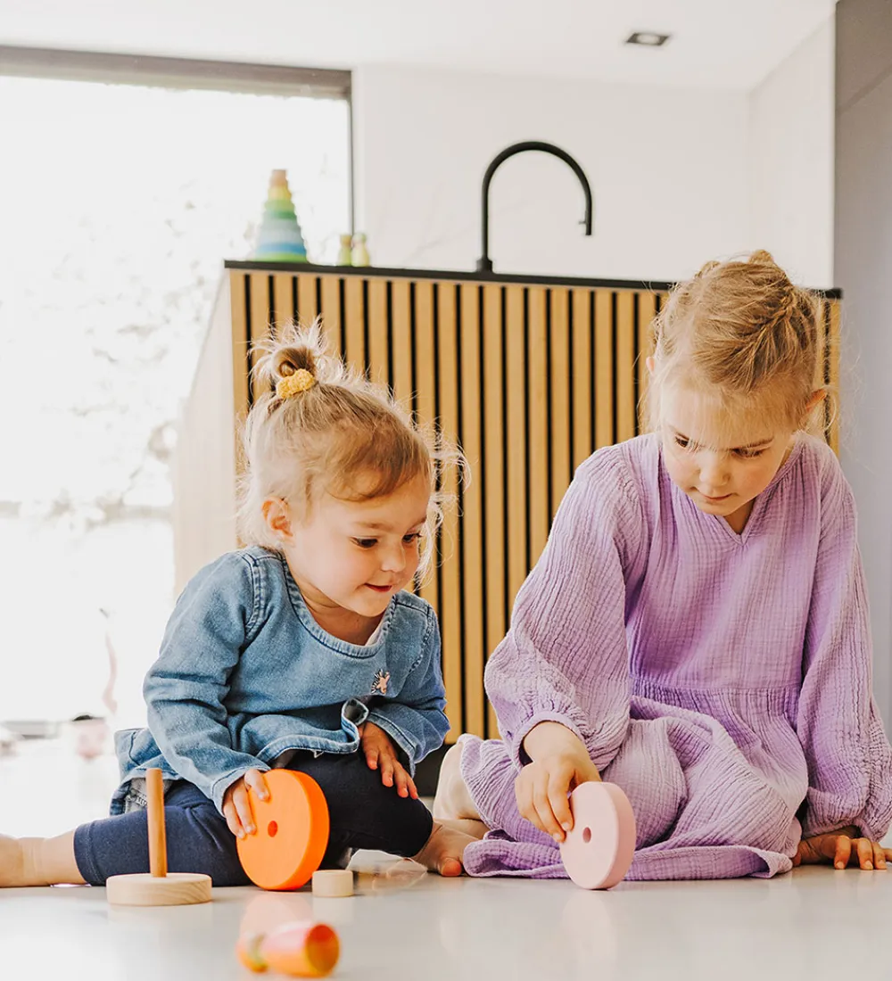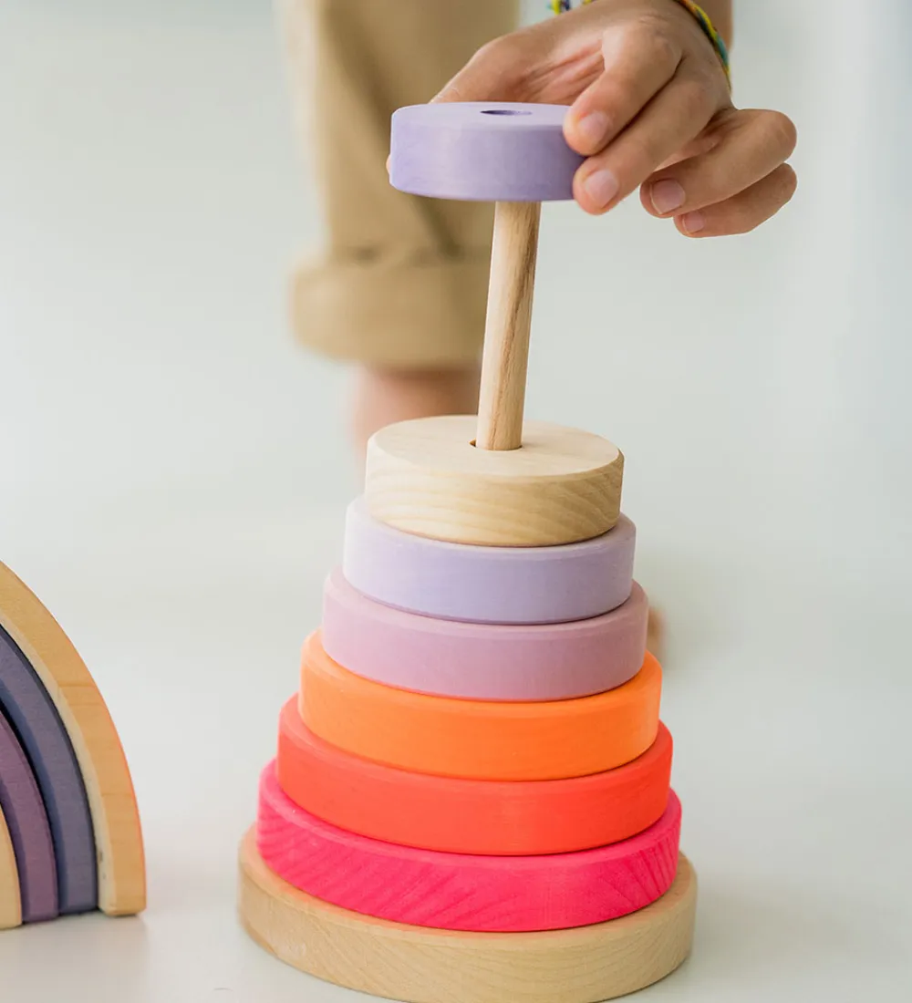 Skønt Grimms stabletårn af træ i rosa og lilla nuancer.