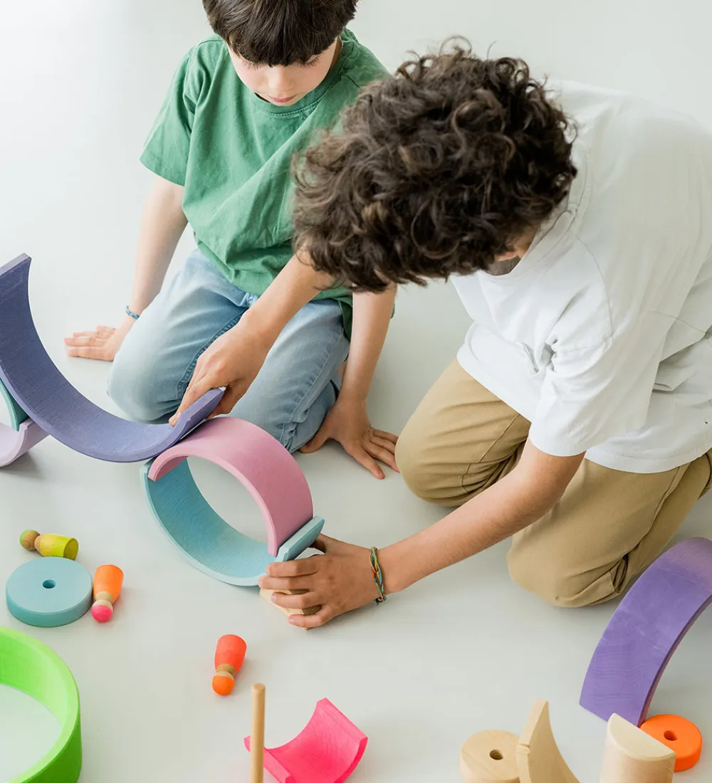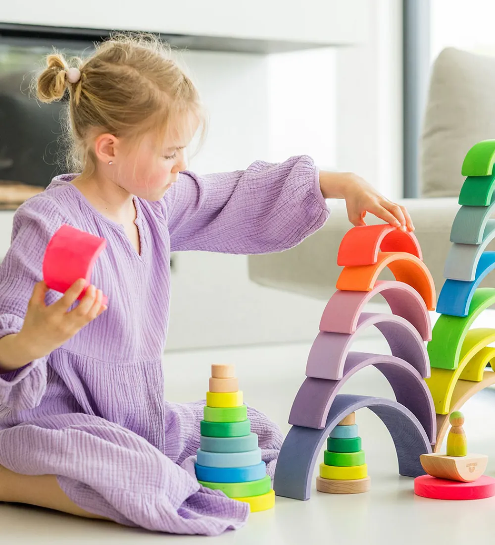 Grimms regnbuen består af 10 buer, som kan sættes sammen til en regnbue, så de små skal finde den rigtige rækkefølge, lidt ligesom et stabletårn. Regnbuen er pefekt til de små, som er ved at øve motorikken og den logiske sans. Når regnbuen ikke bliver leget med, er det oveni en smart dekoration på børneværelset.