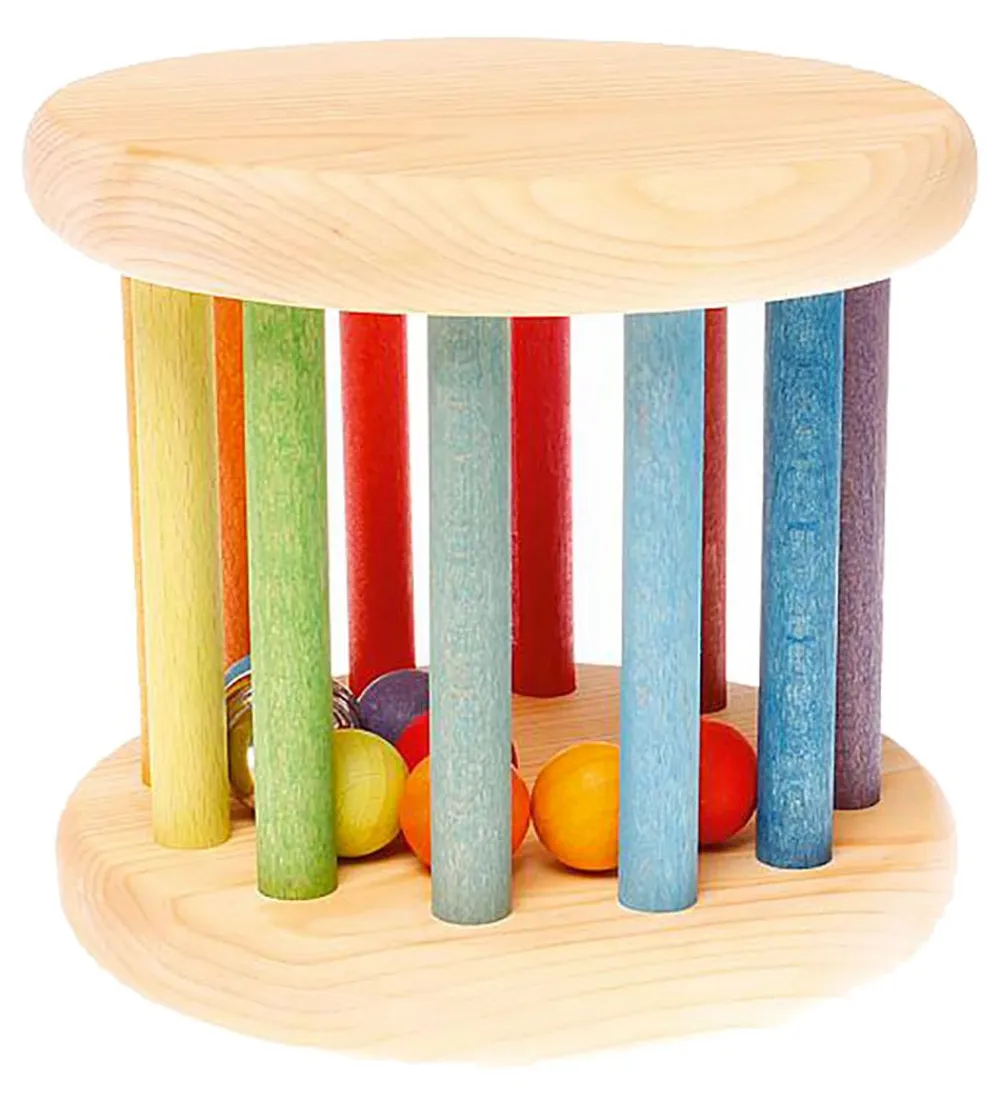 Sjov Grimms trælegetøj bestående af en stor rangle, med en bund og top i naturlig træ og tremmer i regnbuens farver. Indvendigt er der trækugler i regnbuens farver og én i metal.
