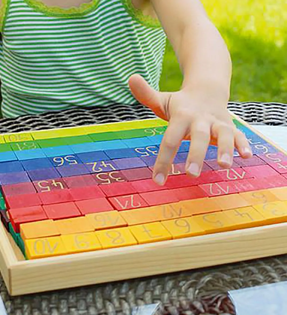 Lærerigt Grimms trælegetøj bestående af en bakke i naturlig træ og 200 brikker, med et farvekodet design, så man lærer hvad de forskellige brikker har af motiv. Hver brik har et tal eller et matematisk symbol (plus, minus, gange, divider og lig med tegn).