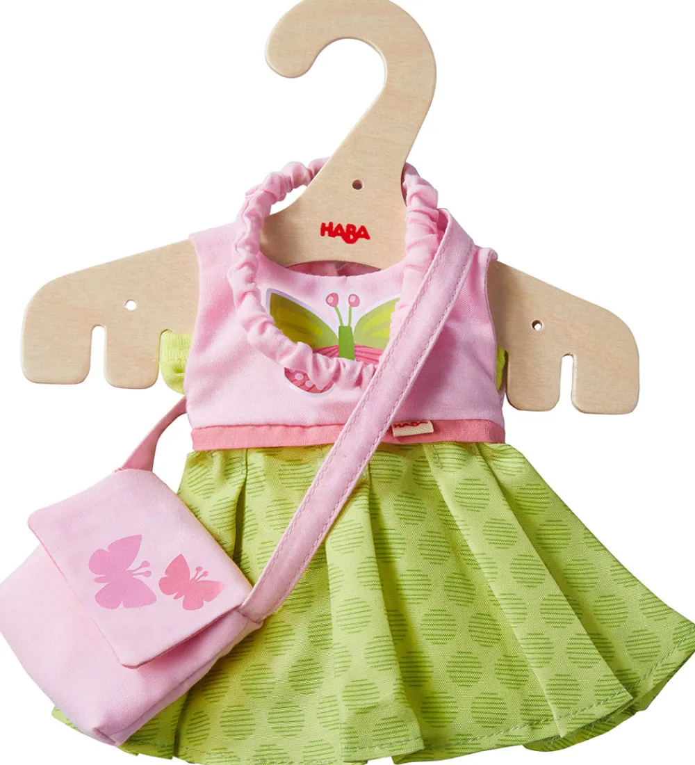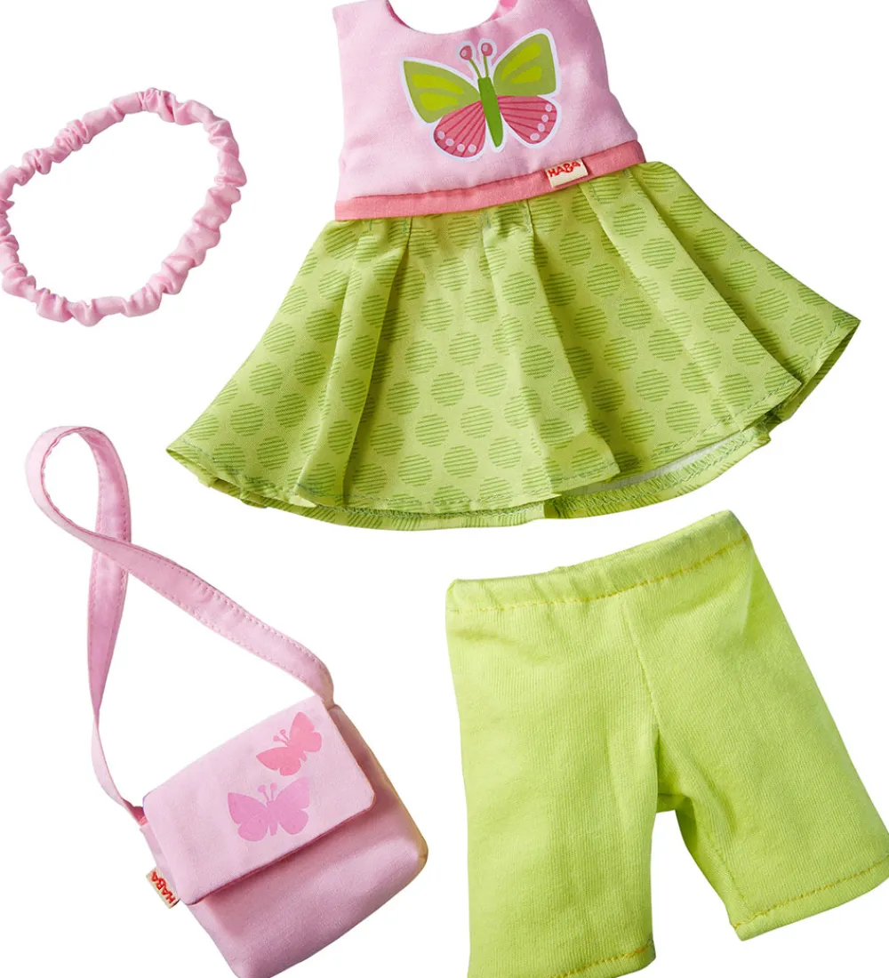 Sødt HABA dukketøj bestående af en kjole i lyserød og grøn med et fint sommerfugleprint på fronten og et par grønne bukser. Med tøjet inkluderer en lyserød taske med sommerfugleprint og et fint hårpynt. Perfekt til små dukkestunder.