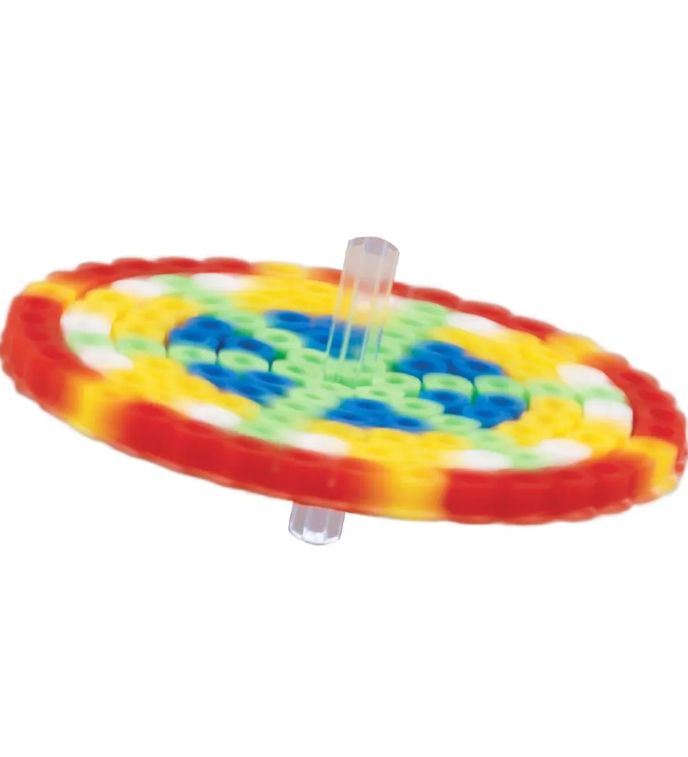 Sjovt Hama perlesæt med et snurretop tema, som man kan lave i lige de farver og mønstre man vil og se den snurre rundt bagefter.