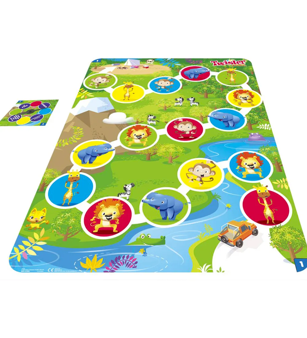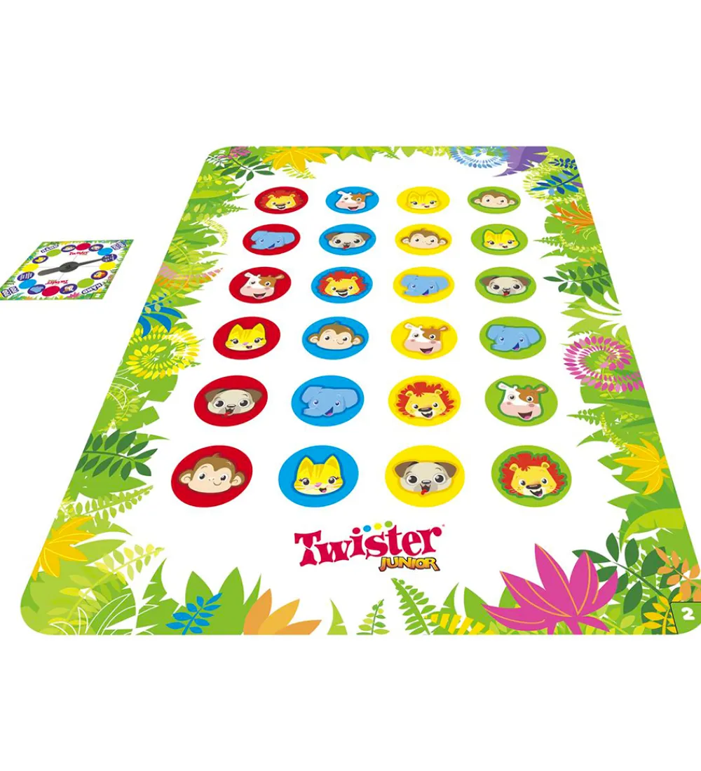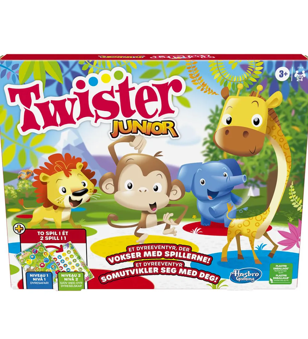 Hasbro Twister spillet er en klassiker og bliver aldrig kedeligt. I juniorudgaven kan der spilles på to forskellige niveauer: niveau 1, hvor man skal gennem spillepladens dyremotiver ved at dreje pilen, og niveau 2, hvor man skal matche farver og dyr med hænder og fødder, man man holder balancen.