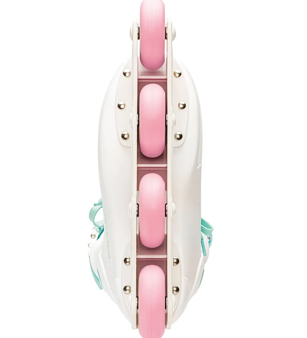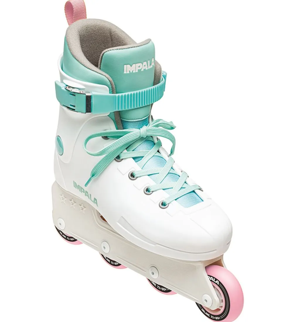 Flotte Impala rulleskøjter i hvid med turkis snøre, spænde samt åbning, hvor hjulene er rosa.