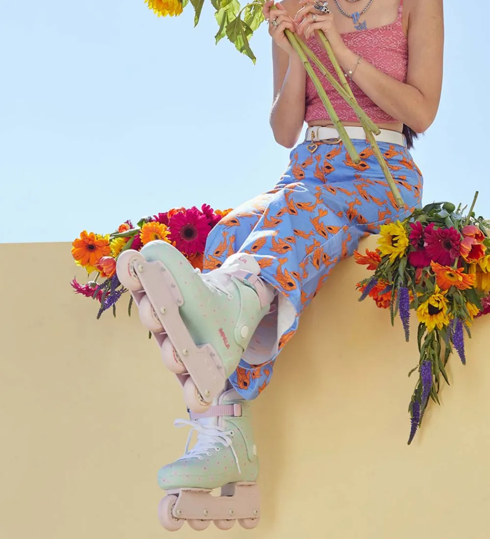 Flotte Impala rulleskøjter i rosa og mintgrøn med alloverprint af rosa blomster.