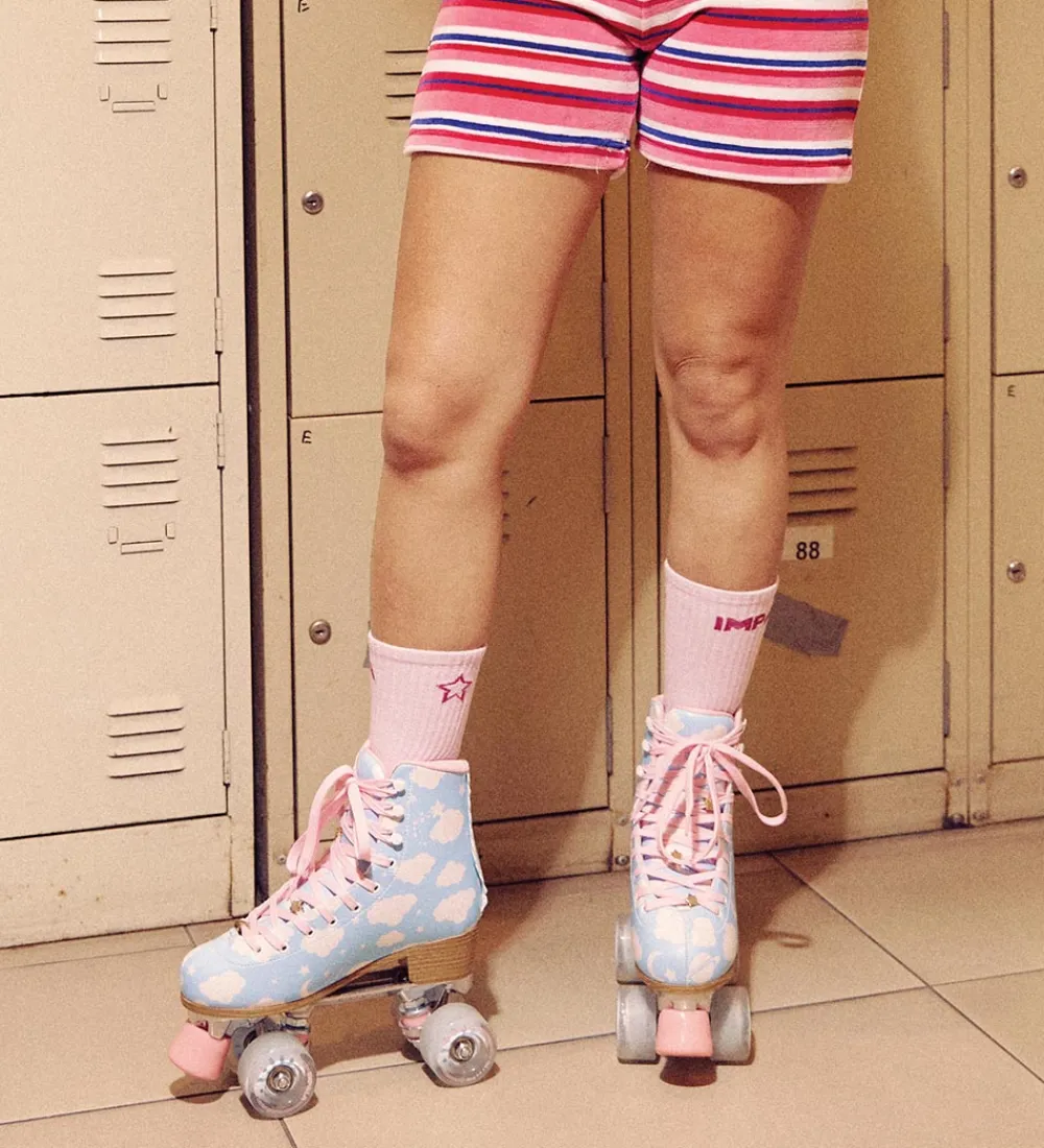 Fine Impala rulleskøjter i lyseblå, med hvide skyer og rosa detaljer. Rulleskøjterne har gennemsigtige hjul med blå og hvide nuancer, en rosa bremse, og ydersålen har et skønt træ-look.