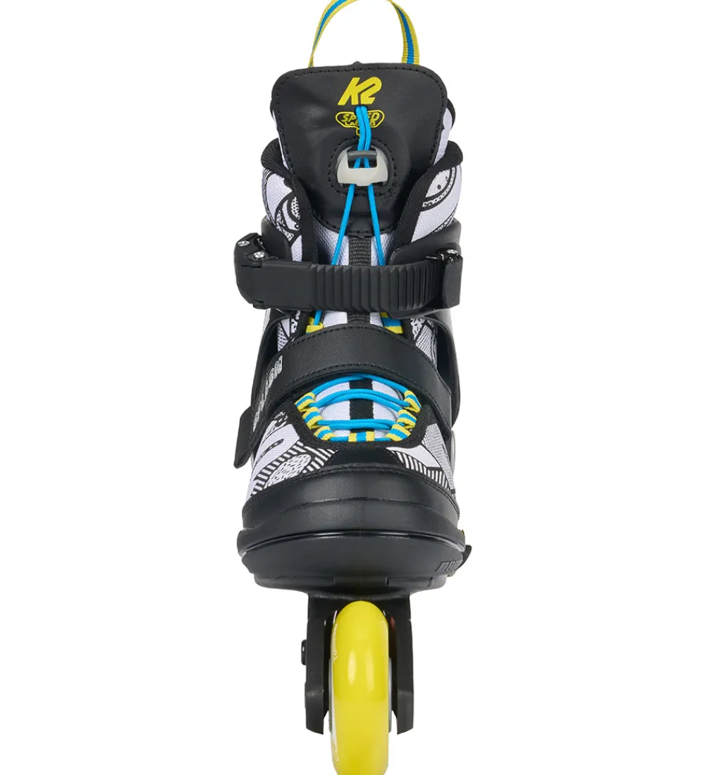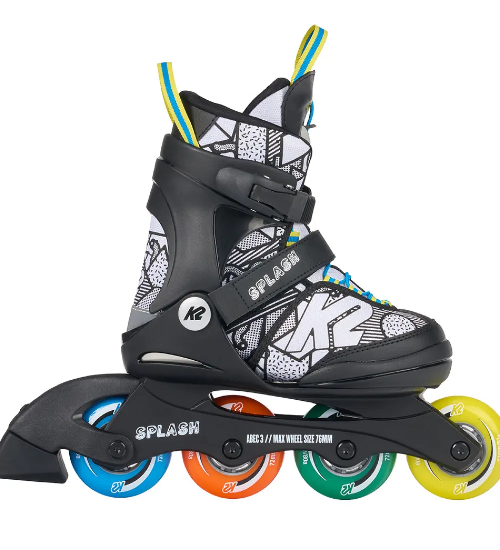 Flotte K2 rulleskøjter i hvid og sort, med gule, grønne, oange og blå hjul. Rullerskøjterne har et flot mønster som man selv kan farvelægge med de 5 medfølgende tusser.
