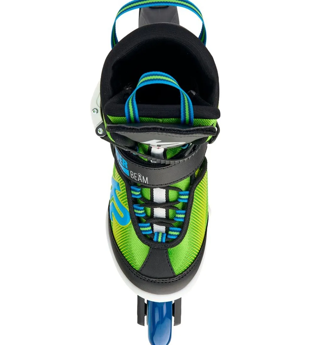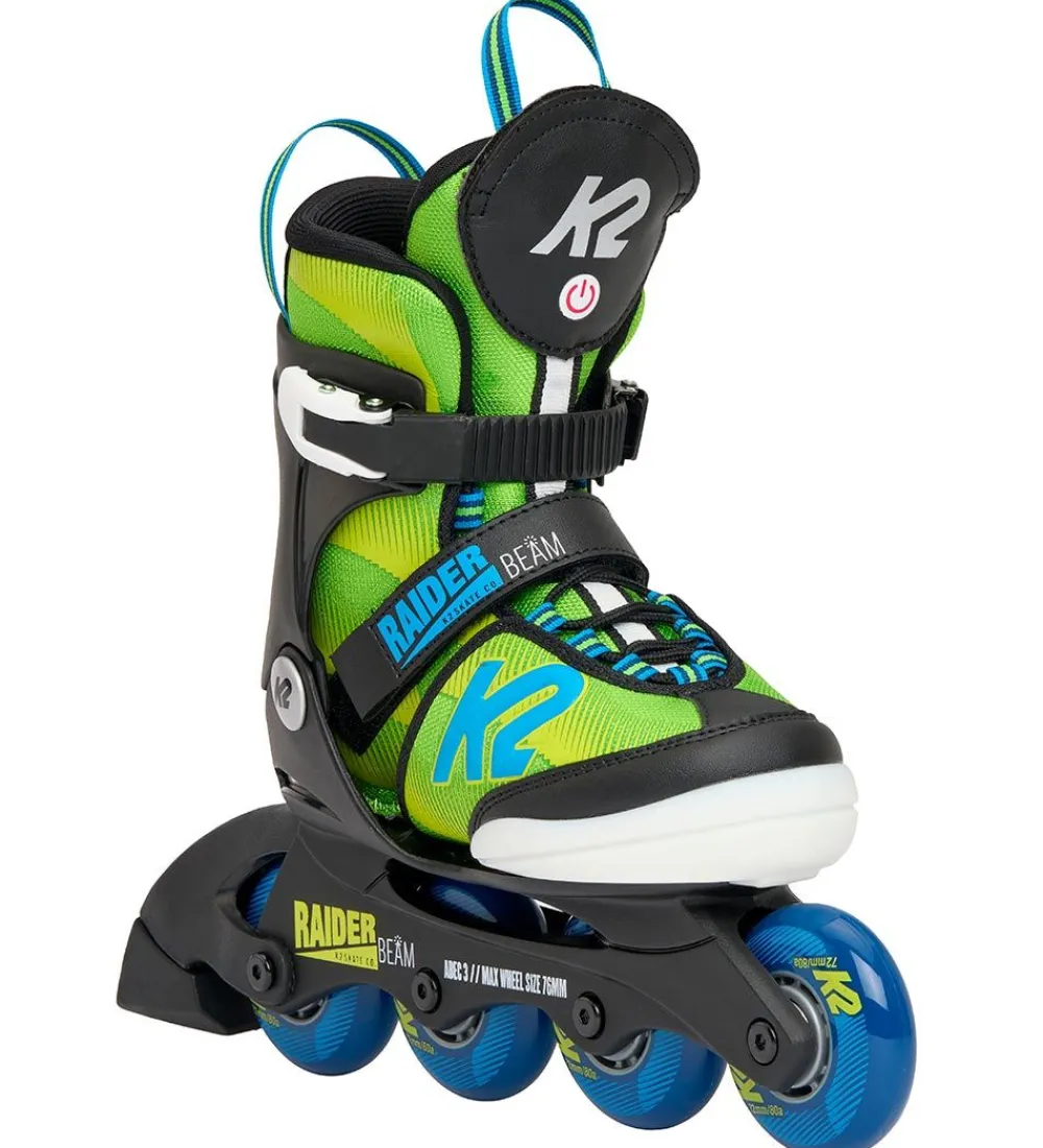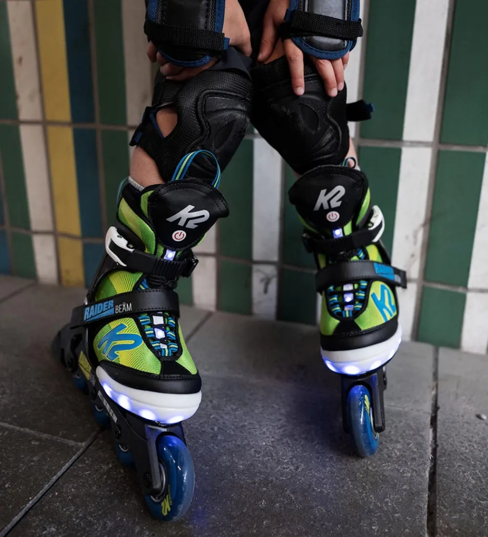 Flotte K2 rulleskøjter i grøn, sort og blå. Rullerskøjterne har en tænd/sluk knap fortil på pløsen, hvor rullerskøjterne lyser med grønt lys med tre forskellige indstillinger.