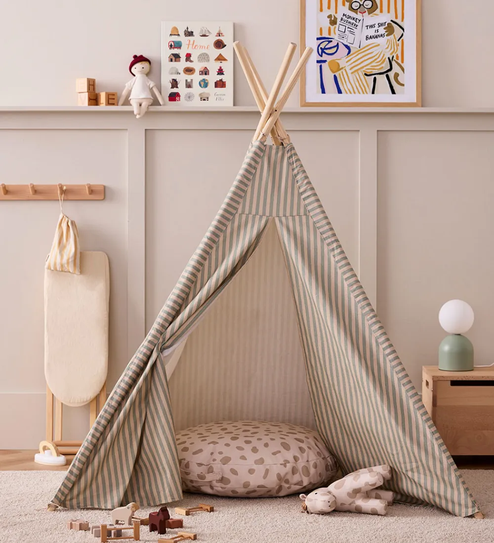 Sødt Kids Concept legetelt med striber i cremehvid og lyseblå.