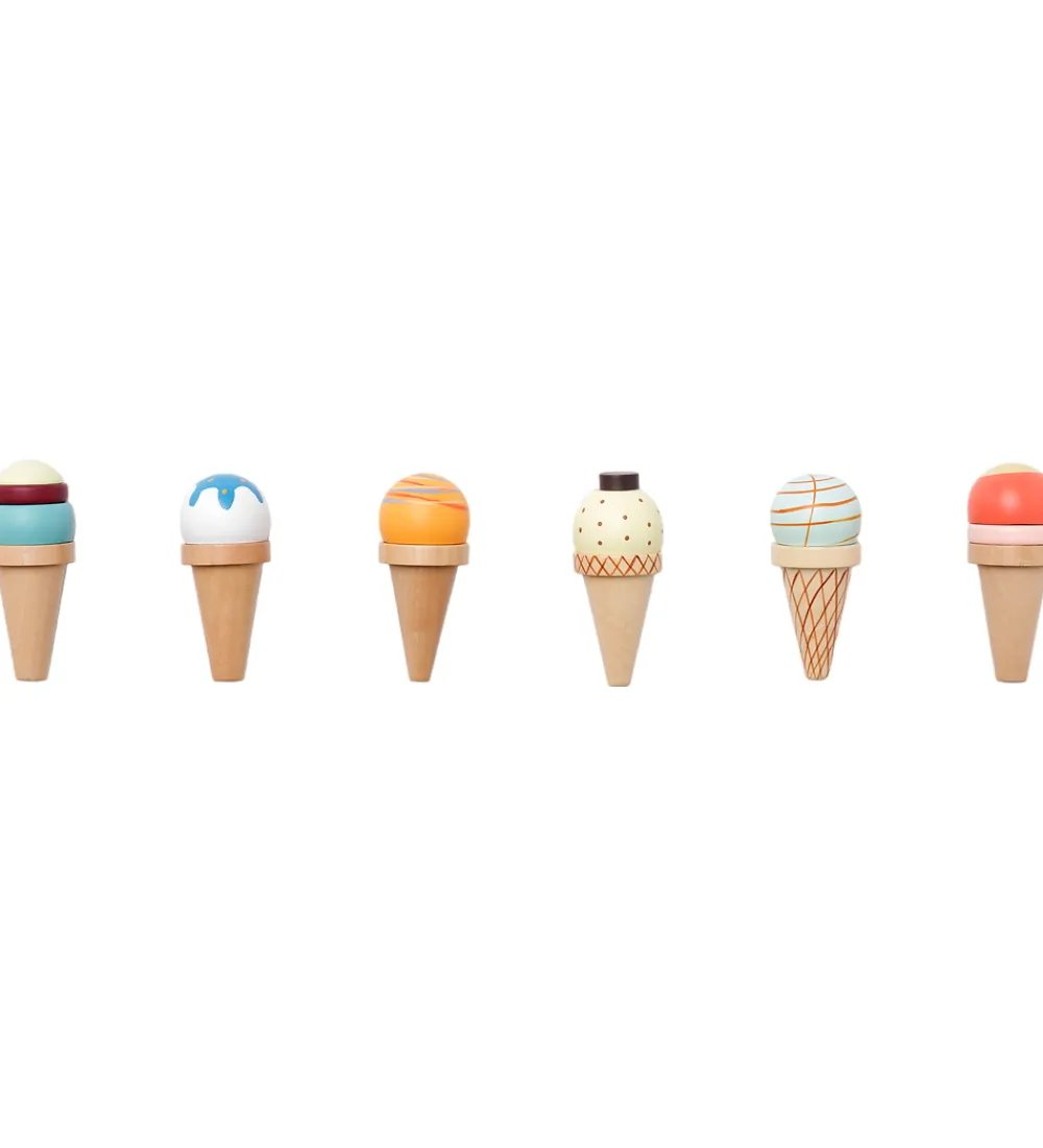 Flot Kids Concept legemad af træ med farverige isvafler i forskellige nuancer, der præsenteres på en elegant hvid og gulstribet bakke. Dette sæt fra Kids Concept bringer glæde og kreativitet ind i legen.