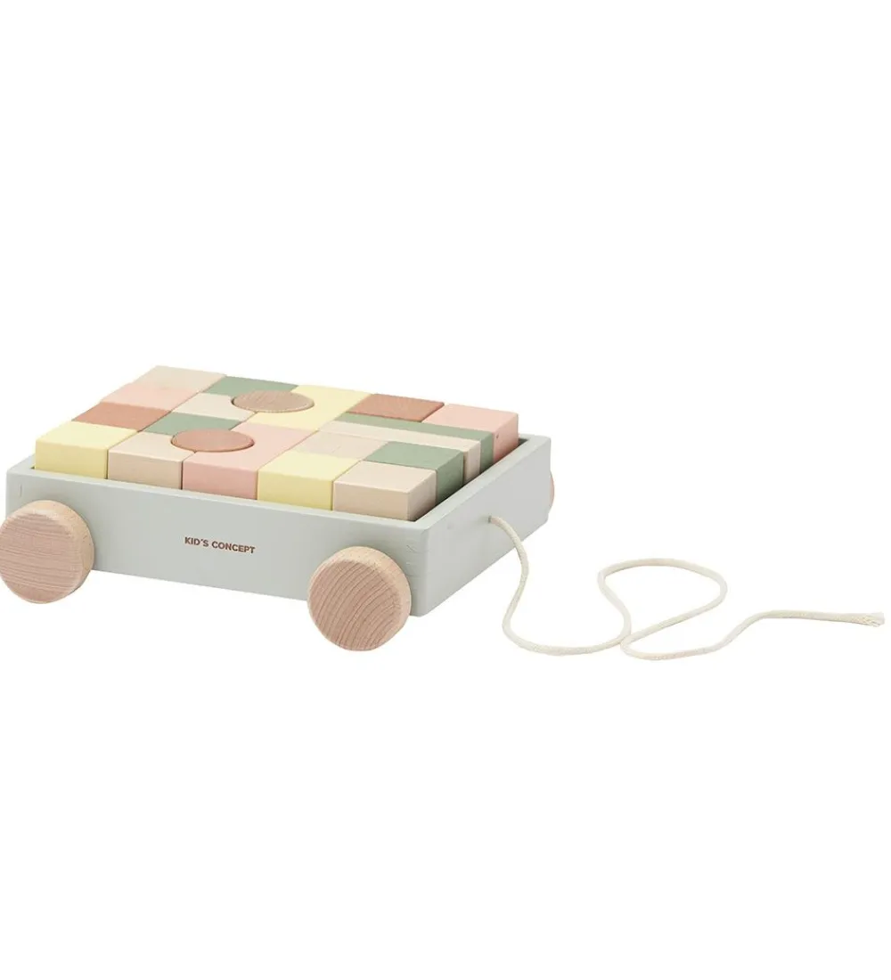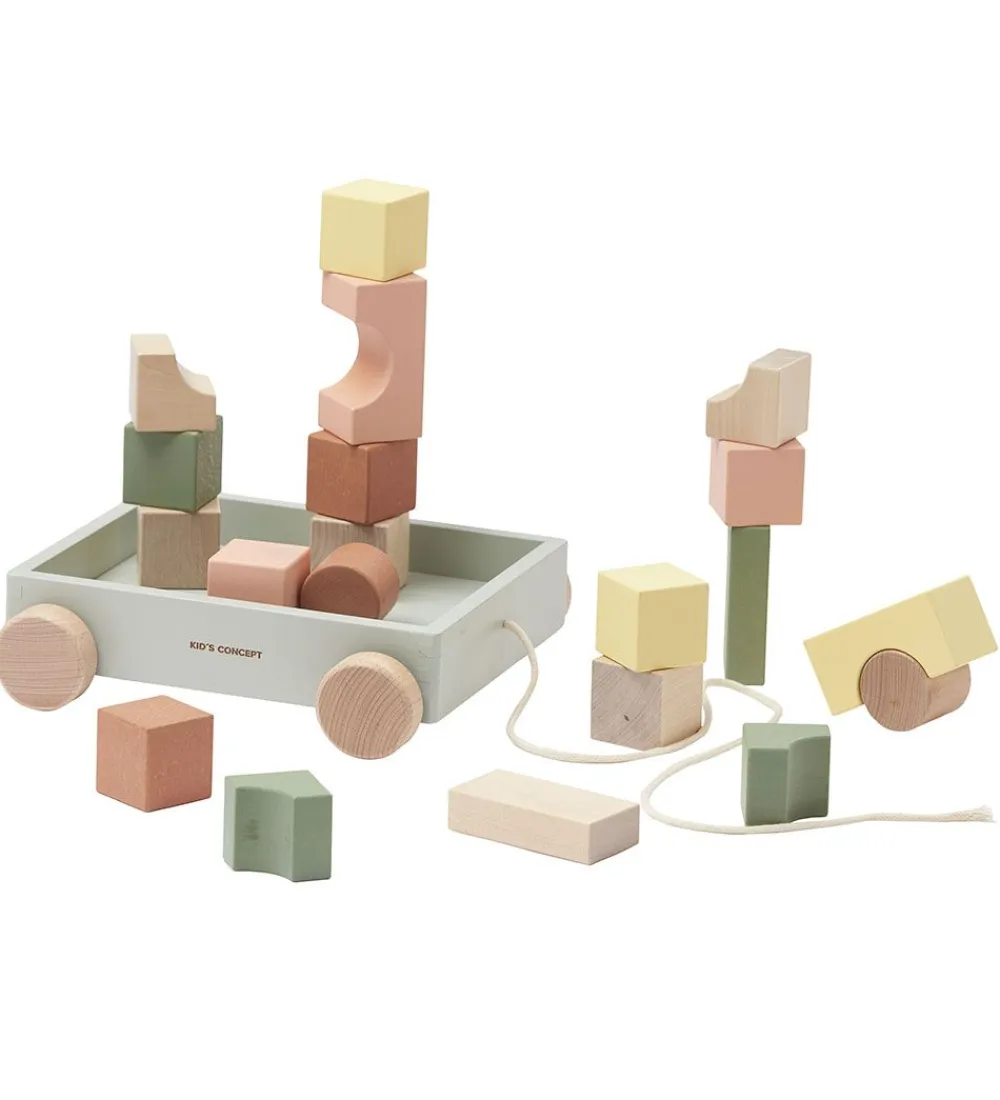 Sjov Kids Concept trækvogn med 20 medfølgende stableklodser i forskellige former, farver og størrelser.