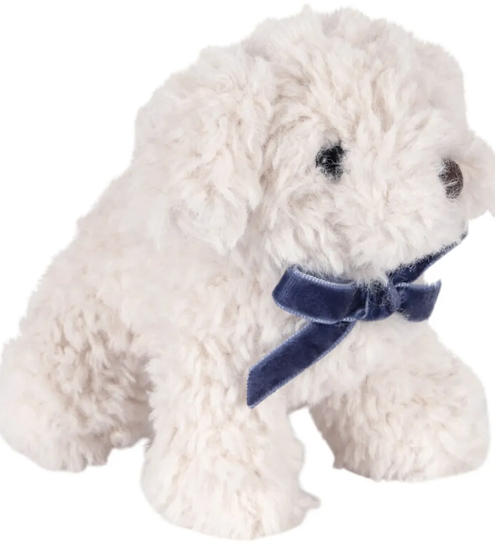 Sød Konges Sløjd bamse med form som en nuttet hundehvalp i hvidt plys og med en blå sløjfe om halsen.