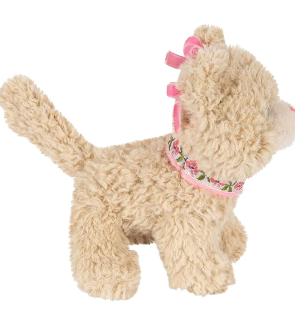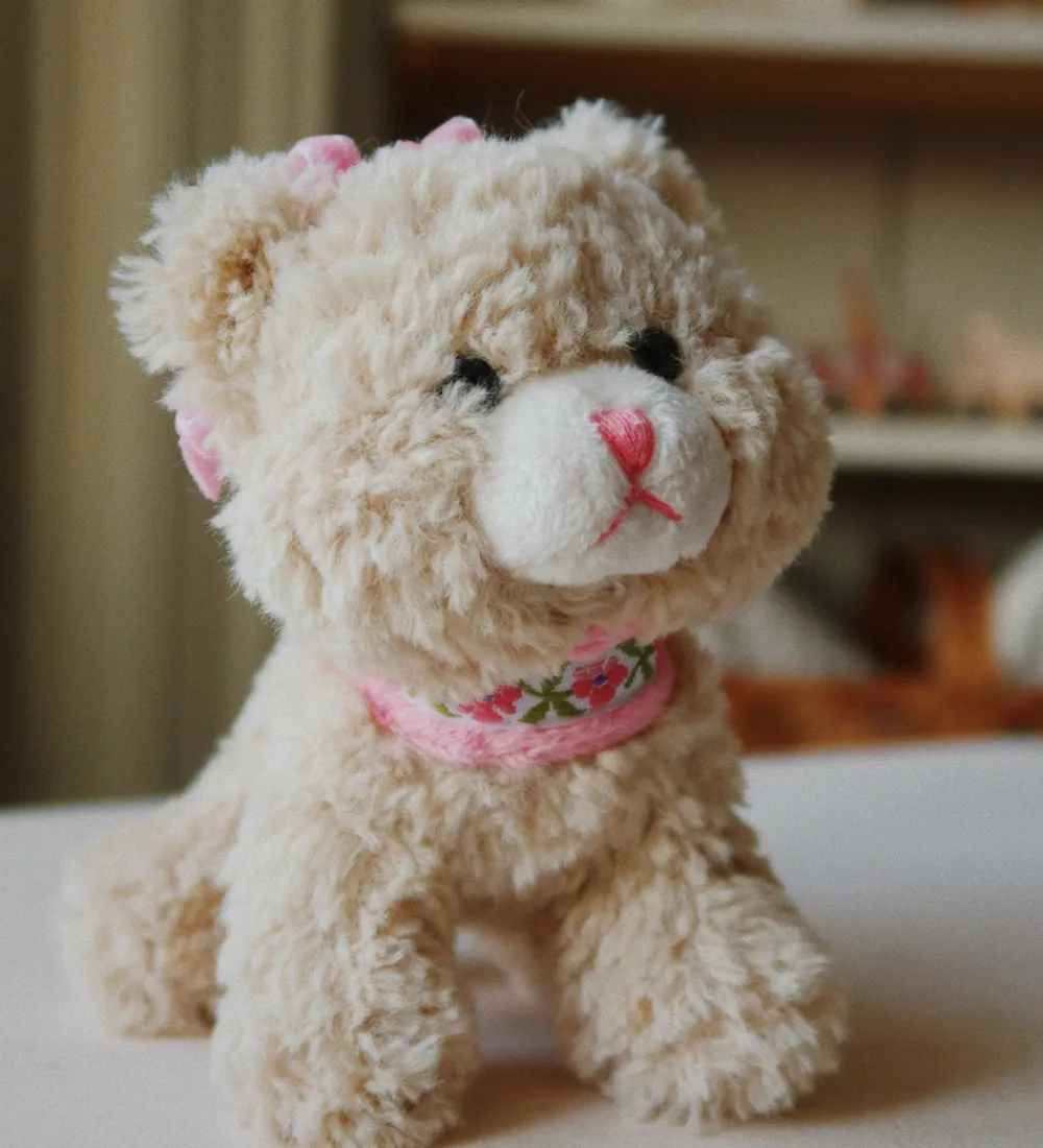 Charmerende rangle fra Konges Sløjd udformet som en blød kat i beige plys. Ranglen har detaljer som en lyserød snude og et blomstret bånd om halsen, hvilket giver et sødt udtryk.