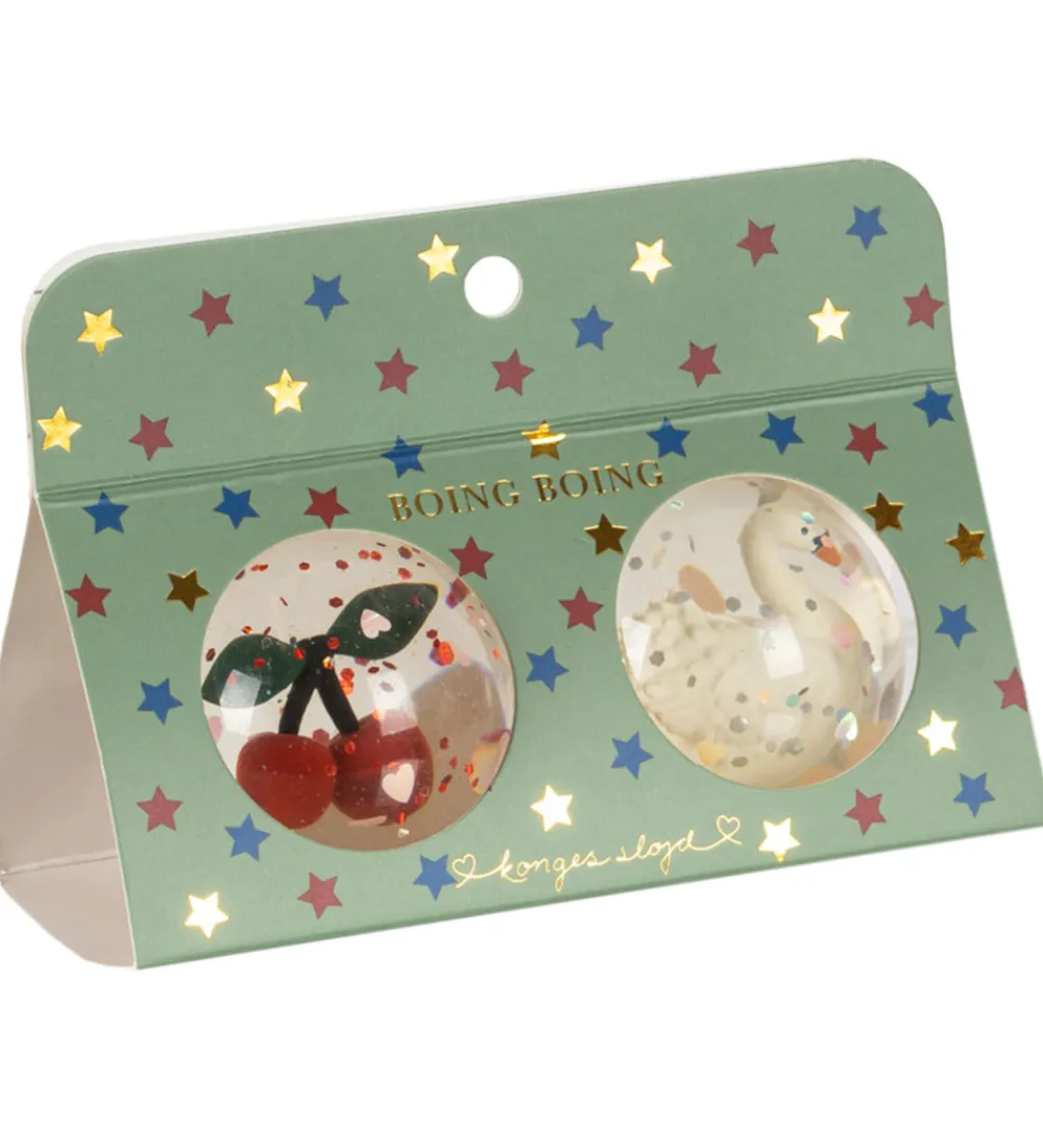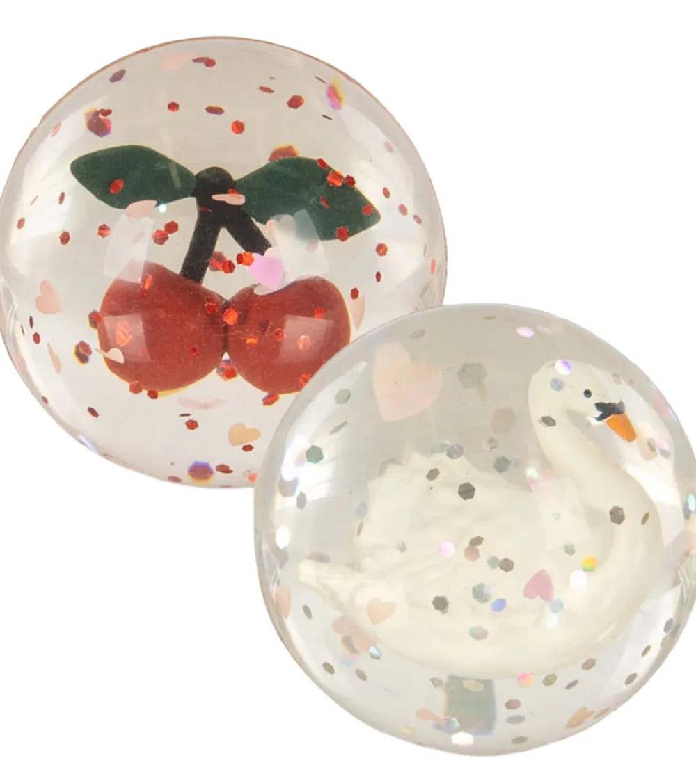 Sjove Konges Sløjd hoppebolde solgt som en 2-pak i transparent gummi med glimmer samt 3D-figurer af klassiske Konges Sløjd motiver, her: kirsebær og svane.