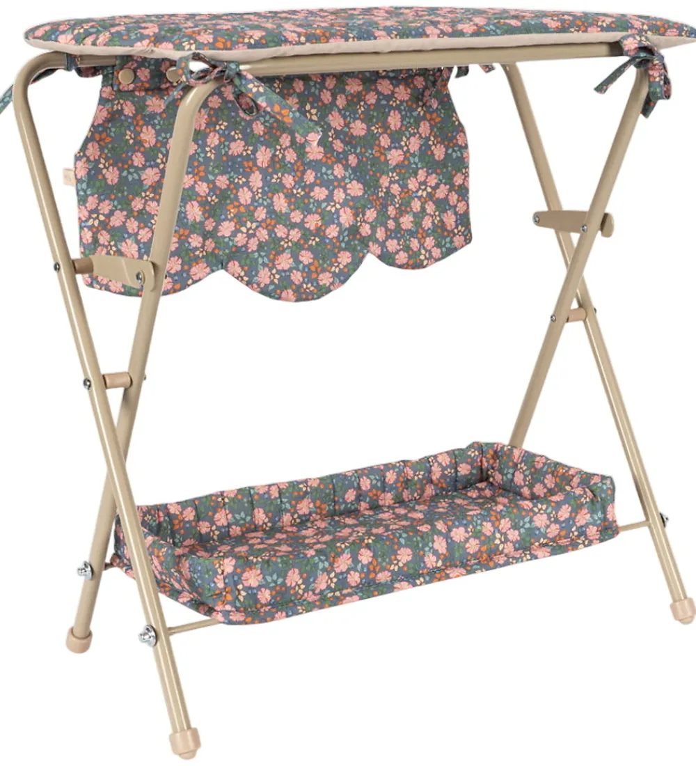 Flot Konges Sløjd puslebord til dukker i grøn med pink blomster og med en quiltet struktur samt bølgede scallop-kanter.