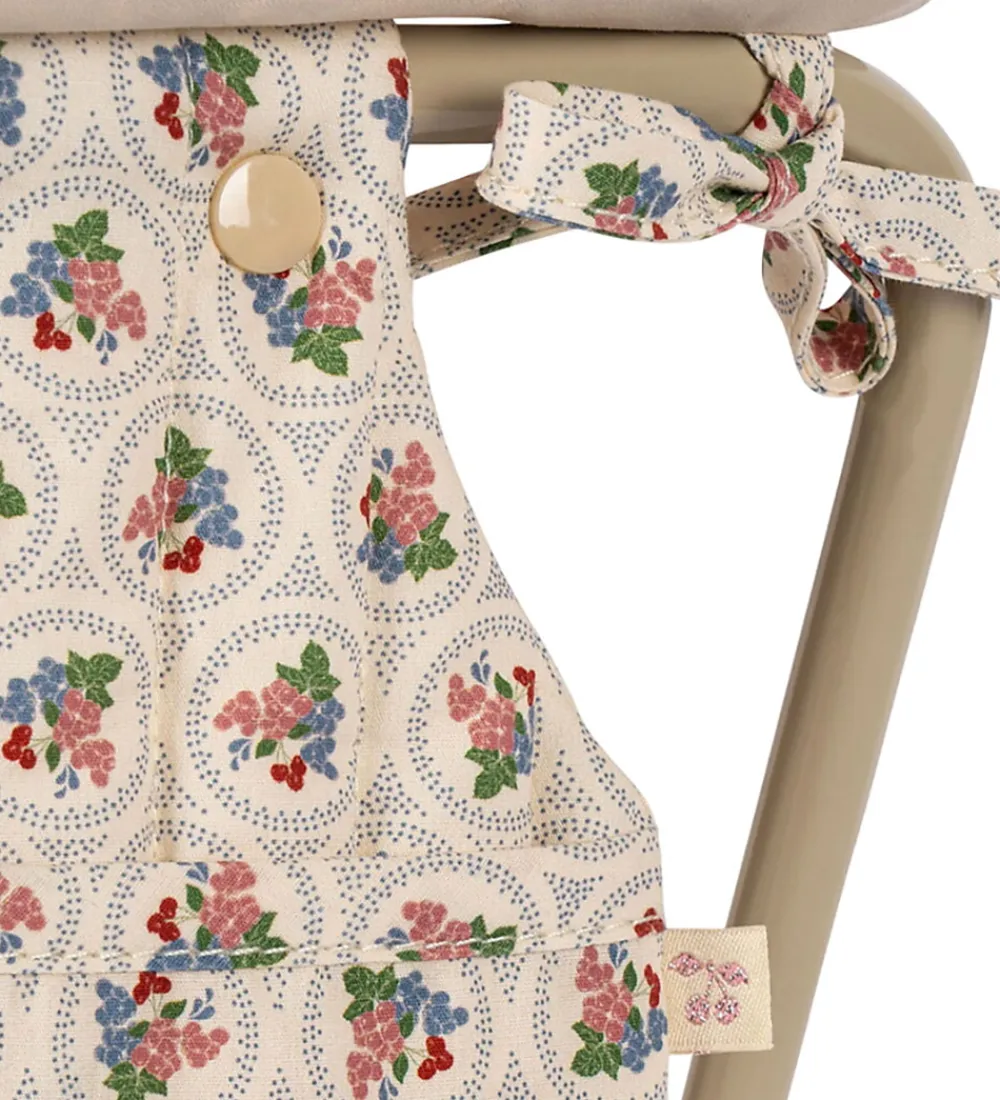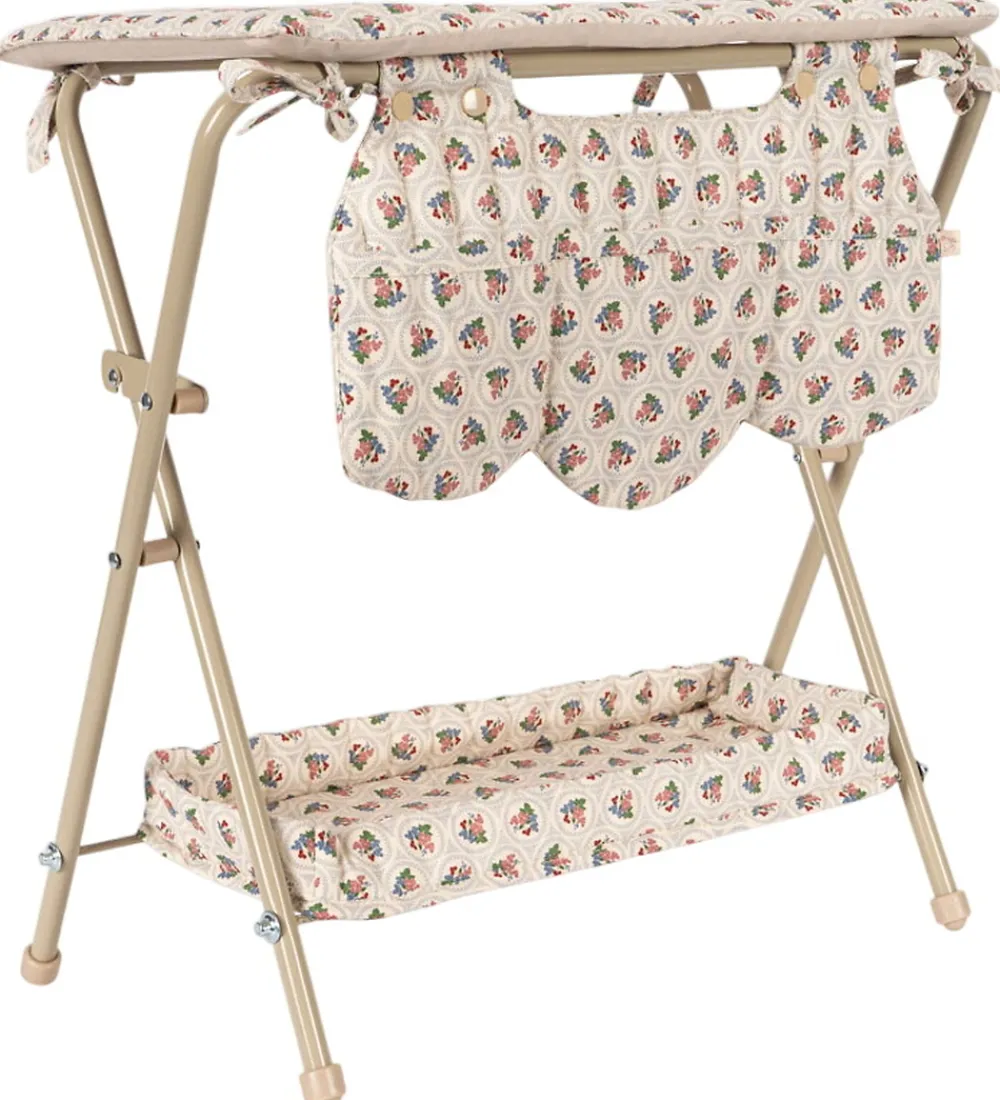 Flot Konges Sløjd puslebord til dukker i rosa med med et print med røde og blå blomster og med en quiltet struktur samt bølgede scallop-kanter.